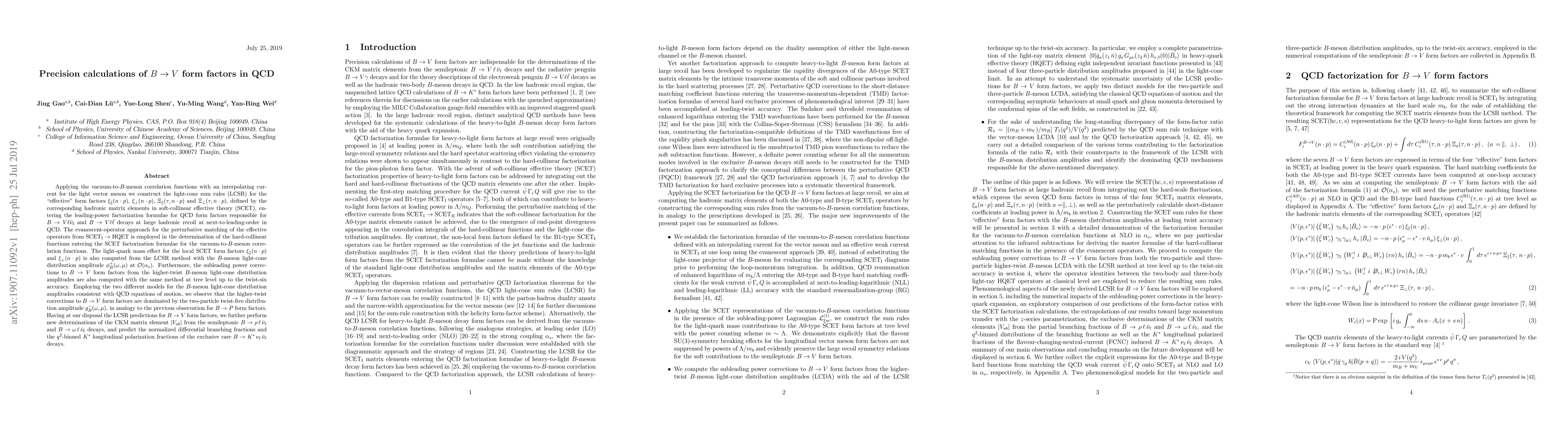 This paper presents precision calculations of $B \to V$ form factors using light-cone sum rules (LCSR) in the framework of soft-collinear effective theory (SCET), determining the effective form factors and their light-quark mass effects. It also predicts CKM matrix element $|V_{ub}|$ and branching fractions for rare $B$ decays.