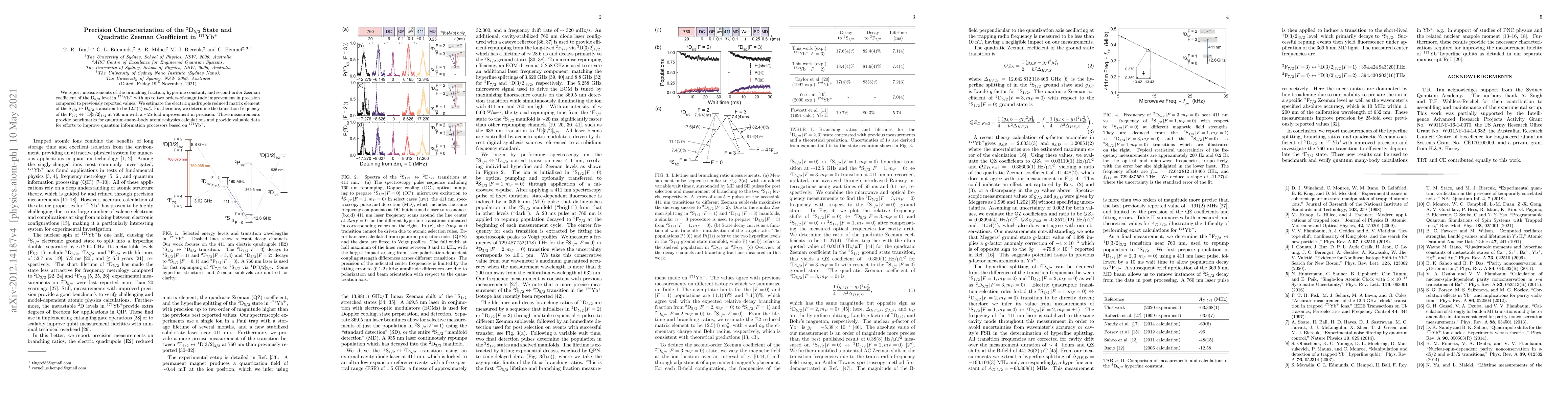 This paper reports highly precise measurements of the D$_{5/2}$ level properties in $^{171}$Yb$^+$, including branching fraction, hyperfine constant, and quadratic Zeeman coefficient, with significant improvements over previous data. The study also determines the transition frequency for the F$_{7/2}$ $\leftrightarrow$ $^{1}$D$[3/2]_{3/2}$ transition at 760 nm, providing valuable data for quantum-many-body atomic-physics calculations and quantum information processing.