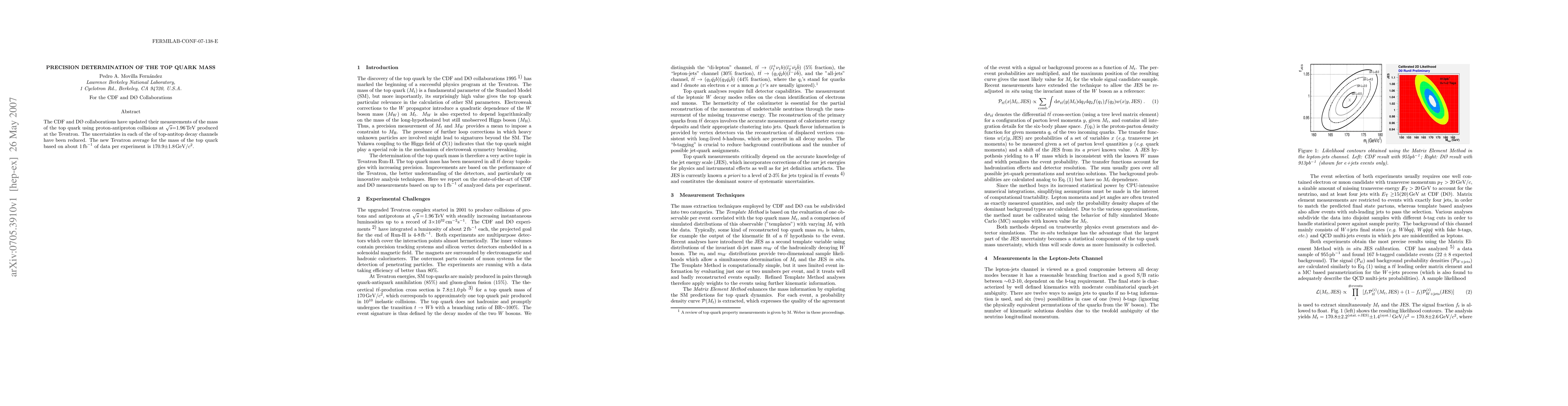 The CDF and D0 collaborations have refined their measurements of the top quark mass using data from proton-antiproton collisions at the Tevatron, yielding a new average mass of 170.9±1.8 GeV/c² with reduced uncertainties.