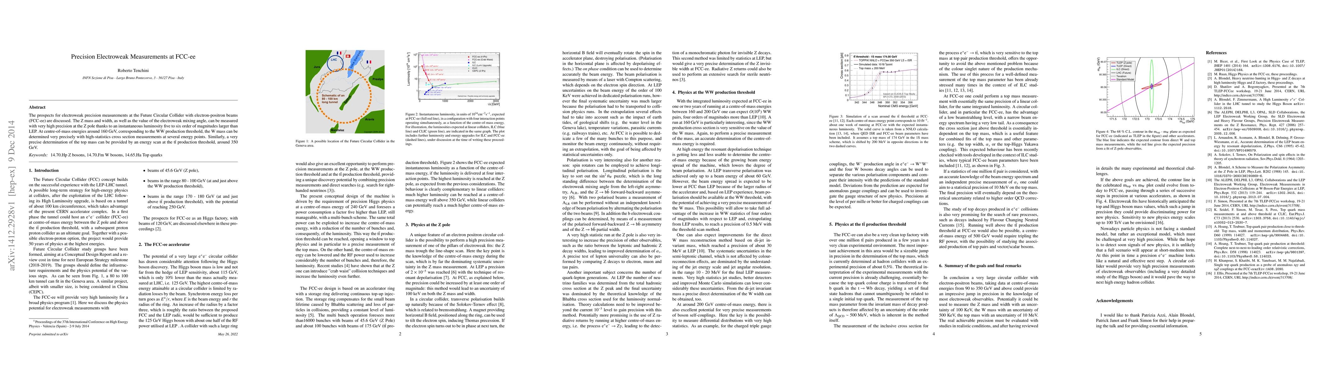 This paper discusses the potential for high-precision electroweak measurements at FCC-ee, including the Z mass and width, electroweak mixing angle, W mass, and top mass, leveraging significantly higher luminosity compared to LEP. Detailed energy scans and cross-section measurements will enable precise determinations at various energy thresholds.