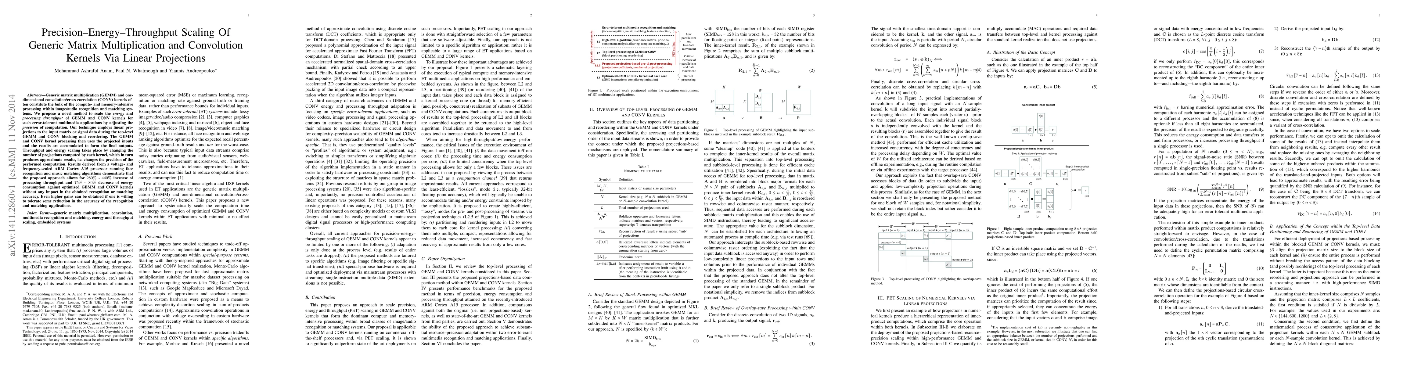 This paper proposes a method to enhance the energy and throughput scaling of GEMM and CONV kernels by adjusting computational precision through linear projections. The approach achieves significant improvements in processing speed and energy efficiency for multimedia applications without compromising recognition or matching accuracy.
