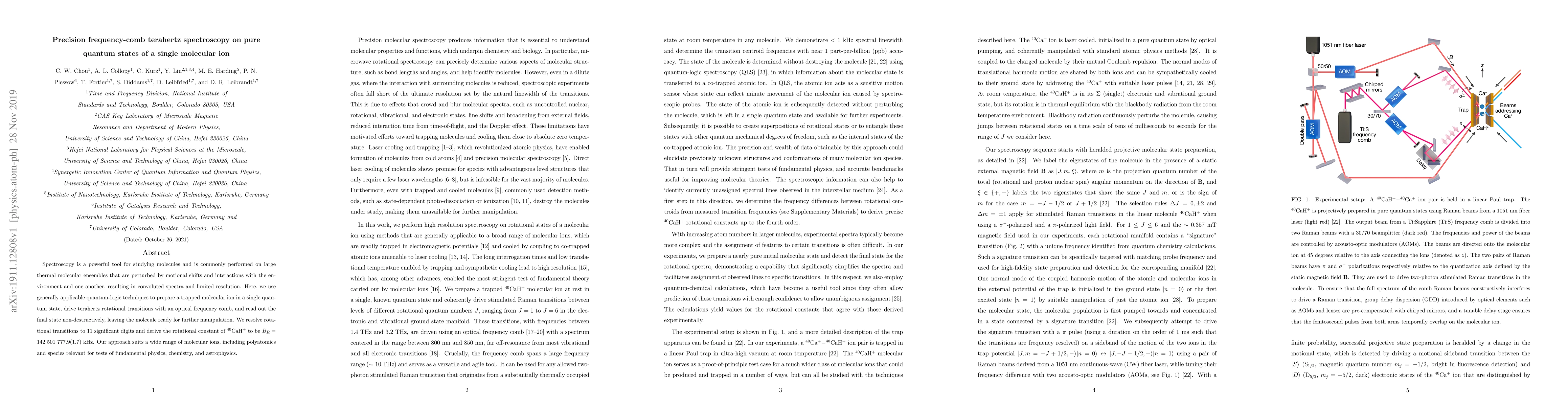 This paper presents a precision spectroscopy technique using frequency-comb terahertz spectroscopy to study pure quantum states of a single molecular ion, achieving high-resolution rotational transitions and determining the rotational constant of CaH+ with exceptional accuracy. The method is broadly applicable to various molecular ions for fundamental physics and chemistry research.
