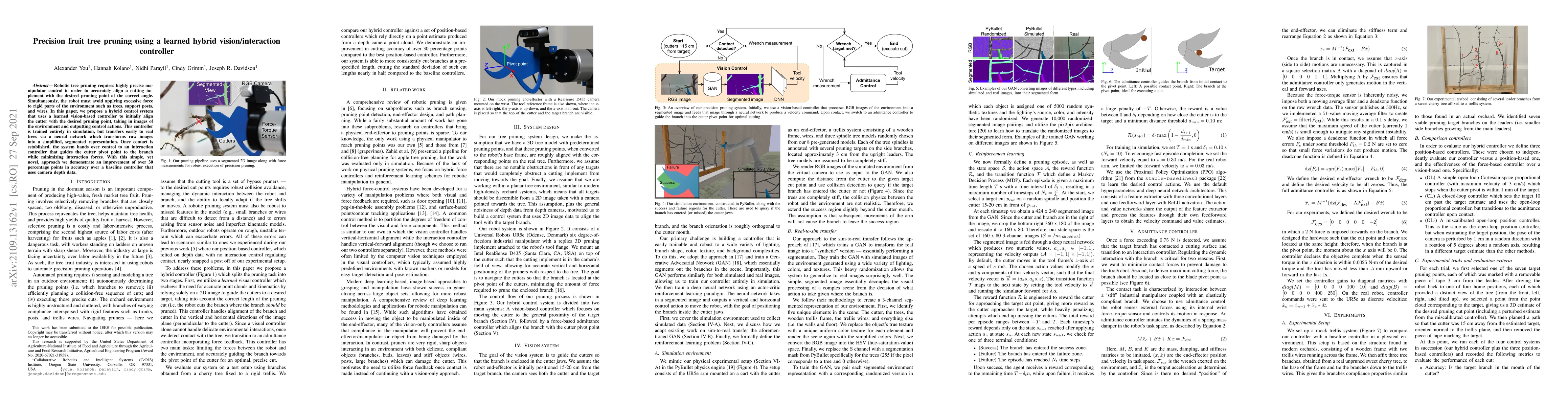 A new hybrid control system improves robotic tree pruning accuracy by 30% compared to a baseline controller, using learned vision/interaction controls to align the cutter with desired points and minimize forces.