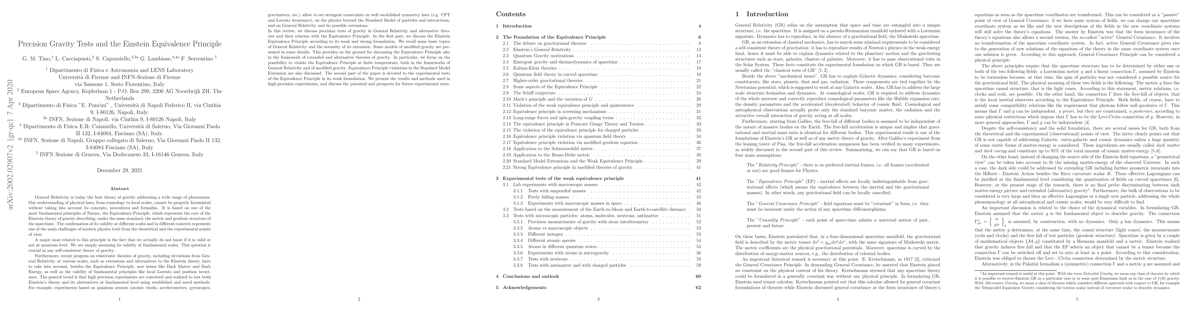 This paper reviews precision tests of gravity within General Relativity and alternative theories, focusing on the Einstein Equivalence Principle. It discusses the principle's weak and strong formulations, explores modified gravity models, and presents high-precision experimental results and future prospects for testing the Equivalence Principle.