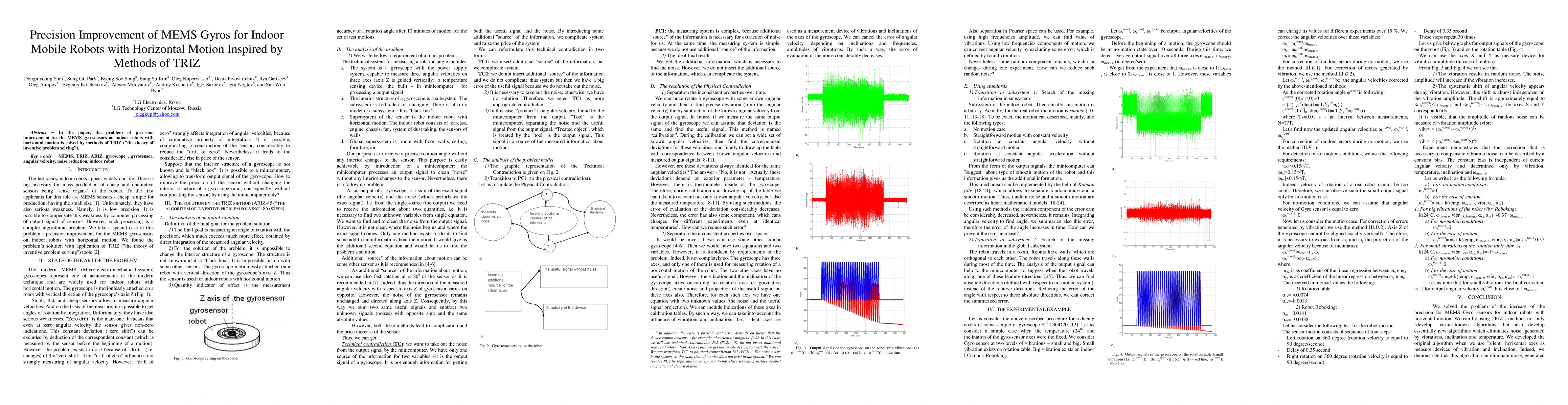 Summary: This paper addresses the precision enhancement of MEMS gyrosensors used in indoor mobile robots with horizontal motion, employing inventive problem-solving techniques from TRIZ to achieve improved accuracy.