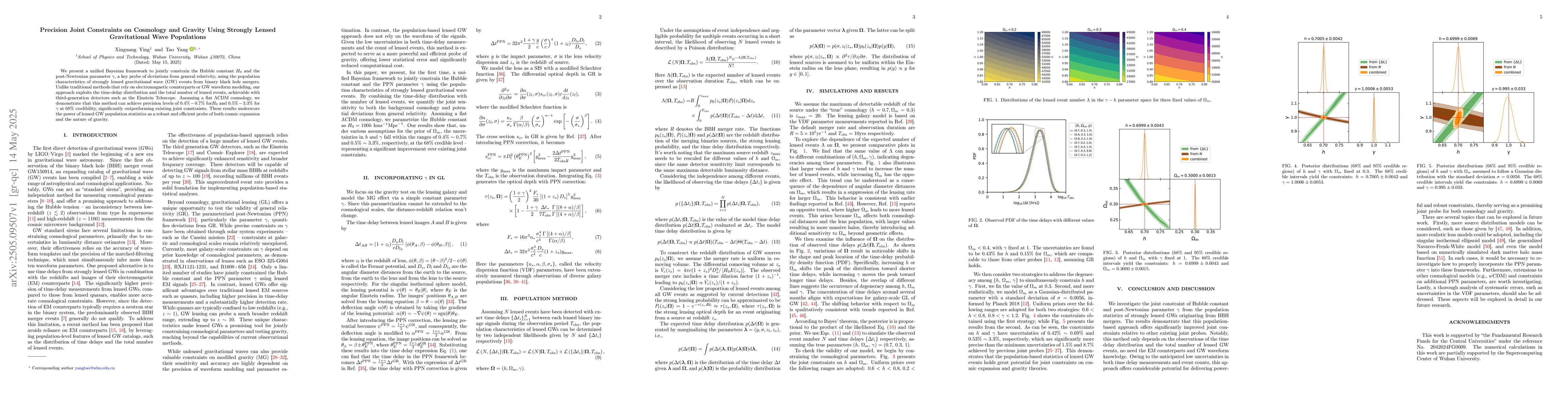 The research presents a Bayesian framework that jointly constrains the Hubble constant $H_0$ and the post-Newtonian parameter $\gamma$ using statistics from strongly lensed gravitational wave events from binary black hole mergers, focusing on time-delay distribution and total number of lensed events achievable with third-generation detectors like the Einstein Telescope.