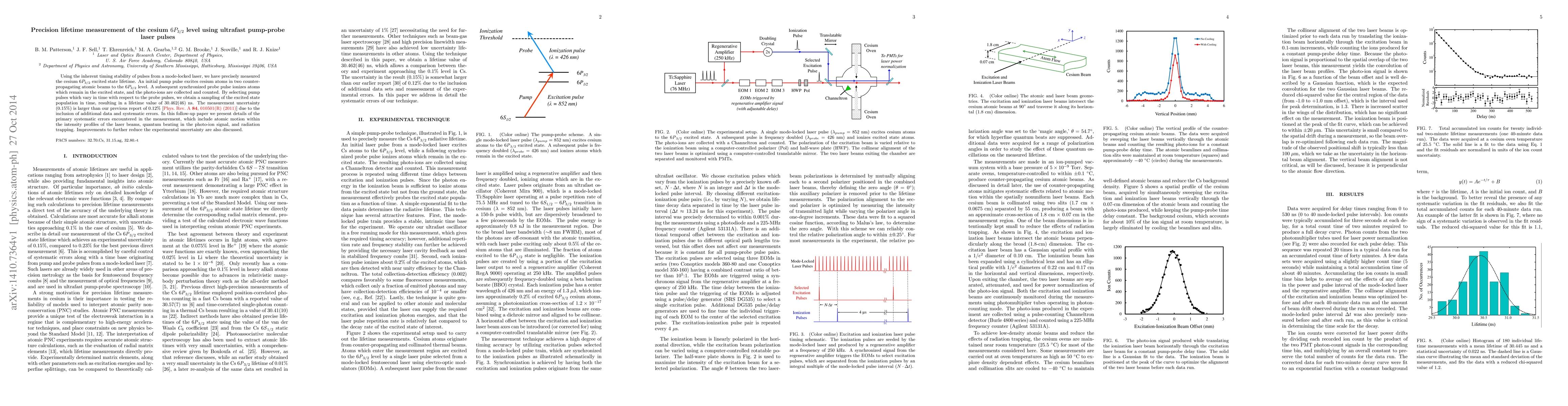 Using the inherent timing stability of pulses from a mode-locked laser, we have precisely measured the cesium $6P_{3/2}$ excited state lifetime. An initial pump pulse excites cesium atoms in two counter-propagating atomic beams to the $6P_{3/2}$ level. A subsequent synchronized probe pulse ionizes atoms which remain in the excited state, and the photo-ions are collected and counted. By selecting pump pulses which vary in time with respect to the probe pulses, we obtain a sampling of the excited state population in time, resulting in a lifetime value of 30.462(46) ns. The measurement uncertainty (0.15%) is larger than our previous report of 0.12% [Phys. Rev. A 84, 010501(R) (2011)] due to the inclusion of additional data and systematic errors. In this follow-up paper we present details of the primary systematic errors encountered in the measurement, which include atomic motion within the intensity profiles of the laser beams, quantum beating in the photo-ion signal, and radiation trapping. Improvements to further reduce the experimental uncertainty are also discussed