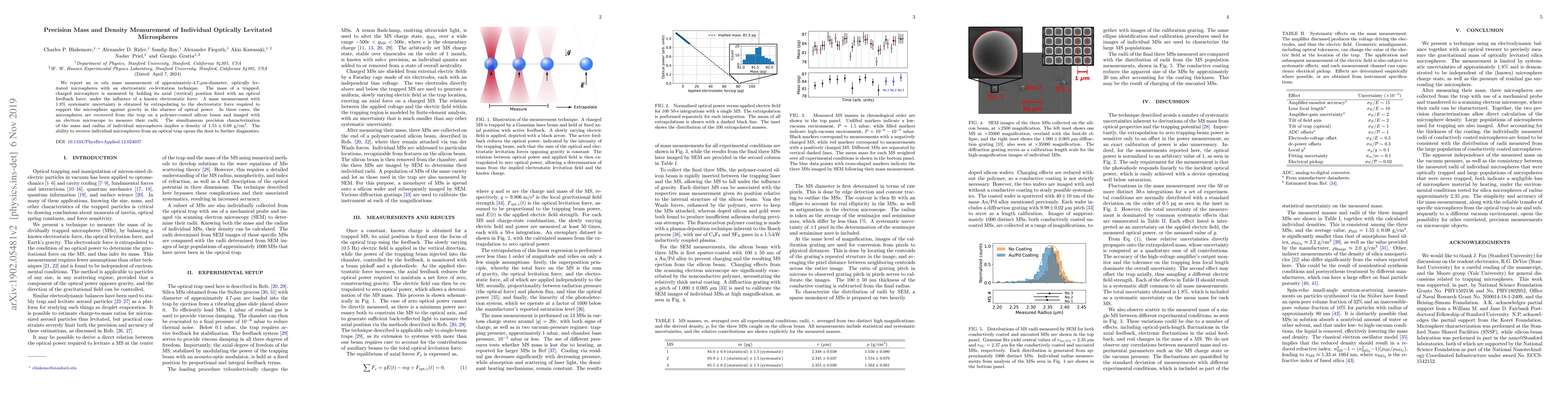 We report an $\textit{in situ}$ mass measurement of approximately-$4.7{\text -}\mu$m-diameter, optically levitated microspheres with an electrostatic co-levitation technique. The mass of a trapped, charged microsphere is measured by holding its axial (vertical) position fixed with an optical feedback force, under the influence of a known electrostatic force. A mass measurement with $1.8\%$ systematic uncertainty is obtained by extrapolating to the electrostatic force required to support the microsphere against gravity in the absence of optical power. In three cases, the microspheres are recovered from the trap on a polymer-coated silicon beam and imaged with an electron microscope to measure their radii. The simultaneous precision characterization of the mass and radius of individual microspheres implies a density of $1.55\pm0.08~$g/cm$^3$. The ability to recover individual microspheres from an optical trap opens the door to further diagnostics.