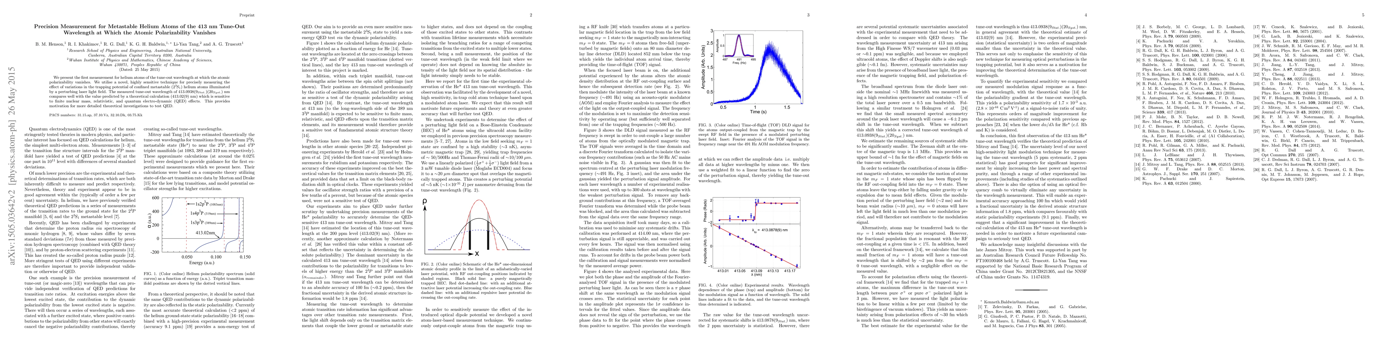 This paper reports the first precise measurement of the tune-out wavelength for metastable helium atoms, where the atomic polarizability vanishes, at 413.0938(9) nm using a novel technique. The result aligns closely with theoretical predictions, supporting the need for further theoretical studies to validate quantum electrodynamics.