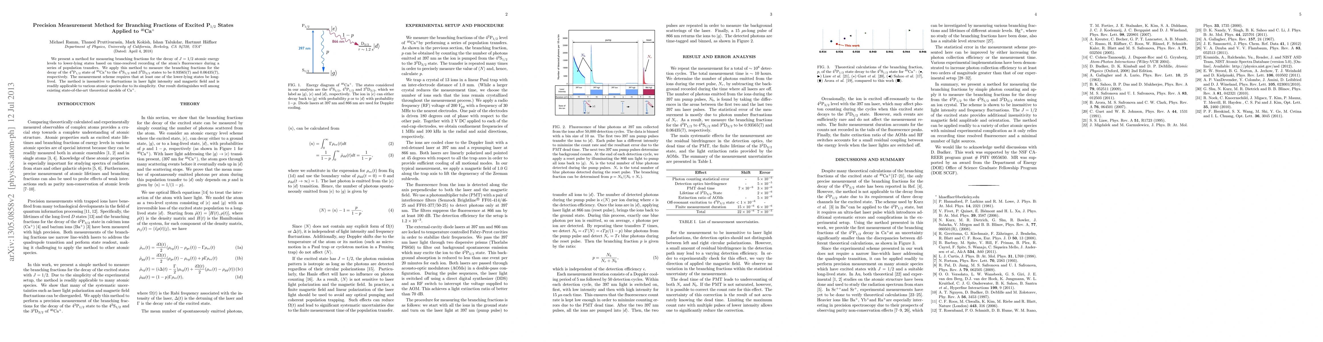 We present a method for measuring branching fractions for the decay of $J = 1/2$ atomic energy levels to lower-lying states based on time-resolved recording of the atom's fluorescence during a series of population transfers. We apply this method to measure the branching fractions for the decay of the 4$^{2}$P$_{1/2}$ state of $^{40}$\Ca to the 4$^{2}$S$_{1/2}$ and 3$^{2}$D$_{3/2}$ states to be \branching\ and \branchingsm, respectively. The measurement scheme requires that at least one of the lower-lying states be long-lived. The method is insensitive to fluctuations in laser light intensity and magnetic field and is readily applicable to various atomic species due to its simplicity. Our result distinguishes well among existing state-of-the-art theoretical models of \Ca.