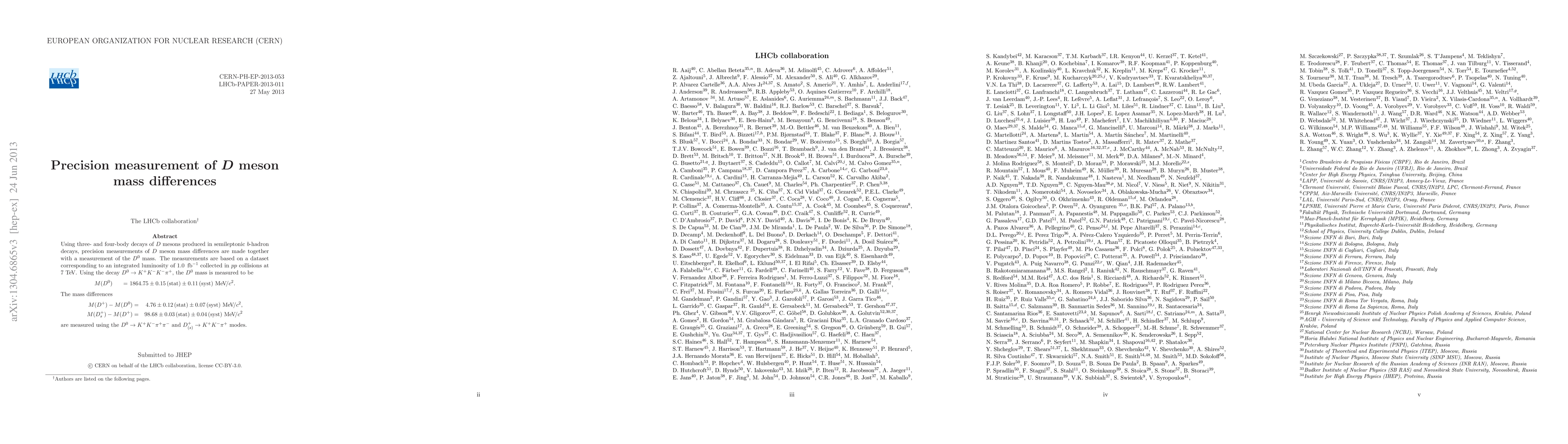 Using three- and four-body decays of $D$ mesons produced in semileptonic $b$-hadron decays, precision measurements of $D$ meson mass differences are made together with a measurement of the $D^{0}$ mass. The measurements are based on a dataset corresponding to an integrated luminosity of $1.0 fb^{-1}$ collected in $pp$ collisions at 7\,TeV. Using the decay $D^0 \rightarrow K^{+} K^{-} K^{-} \pi^{+}$, the $D^0$ mass is measured to be $M(D^0) &=& 1864.75 \pm 0.15 \,({\rm stat}) \pm 0.11 \,({\rm syst}) \, \textrm{MeV/c^2}$. The mass differences $M(D^{+}) - M(D^{0}) = 4.76 \pm 0.12 \,({\rm stat}) \pm 0.07 \,({\rm syst}) \, \textrm{MeV/c^2}$ and $M(D^{+}_s) - M(D^{+}) = 98.68 \pm 0.03 \,({\rm stat}) \pm 0.04 \,({\rm syst}) \, \textrm{MeV/c^2}$ are measured using the $D^0 \rightarrow K^{+} K^{-} \pi^{+} \pi^{-}$ and $D^{+}_{(s)} \rightarrow K^{+}K^{-} \pi^{+}$ modes.