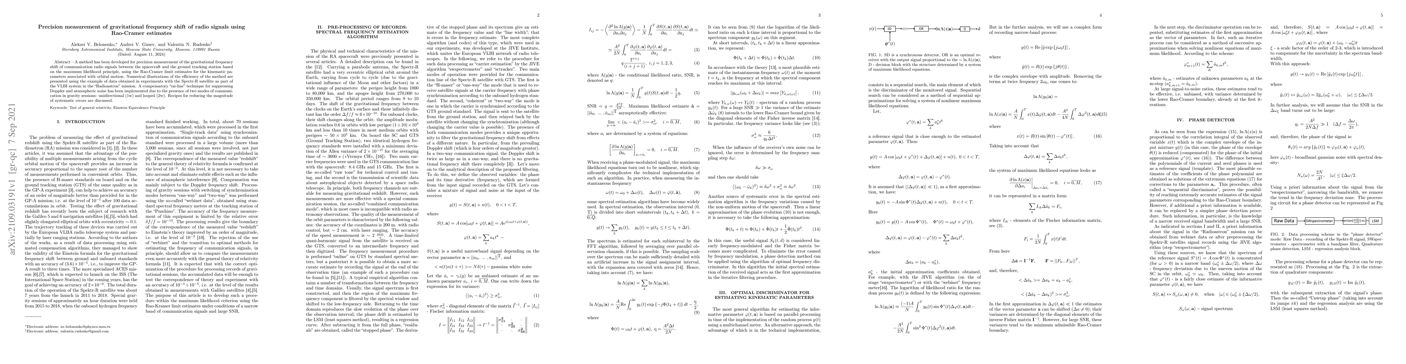 This paper presents a method for accurately measuring gravitational frequency shift in radio signals using Rao-Cramer estimates, validated with data from the Spectr-R satellite. The method incorporates an "on-line" technique to mitigate Doppler and atmospheric noise, and discusses strategies for minimizing systematic errors.