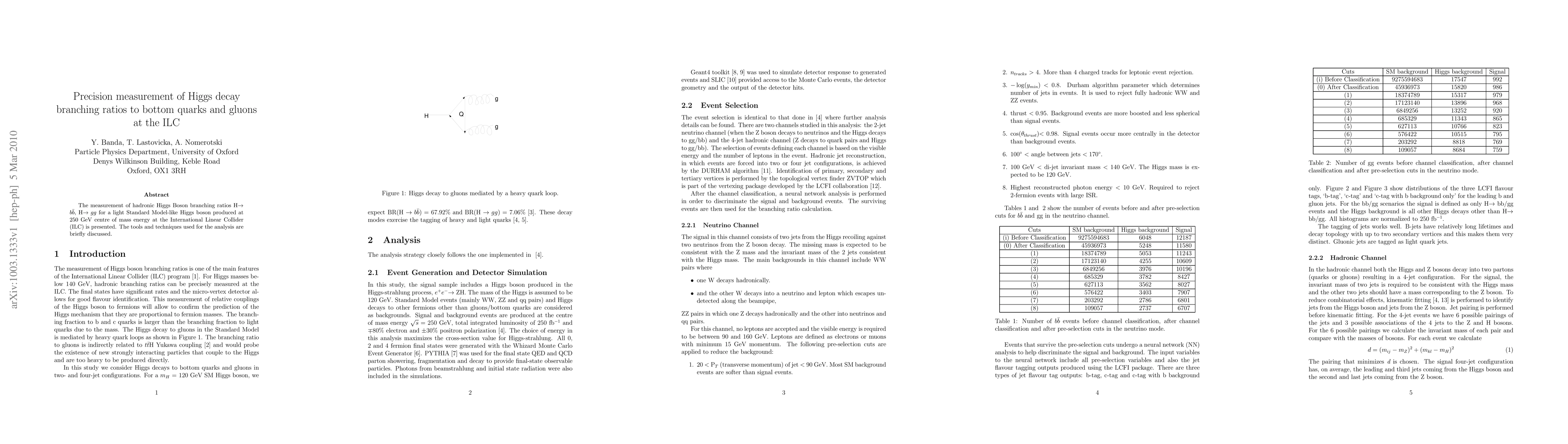 This paper presents a precise measurement of the Higgs boson decay branching ratios to bottom quarks (H -> bb) and gluons (H -> gg) at the International Linear Collider (ILC) operating at 250 GeV. The study discusses the analytical tools and techniques used to achieve these measurements.
