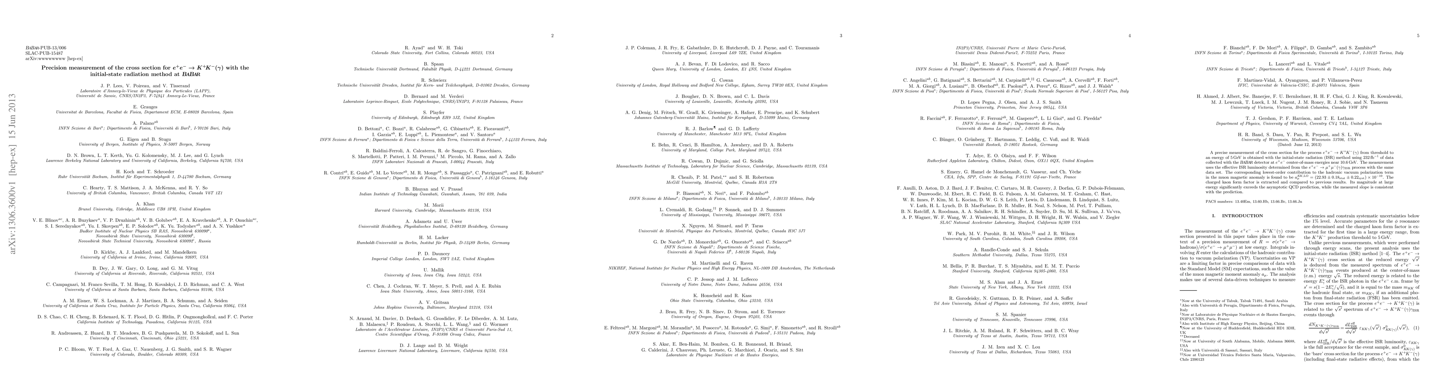 This paper reports a precise measurement of the e+e- --> K+K-(gamma) cross section using the initial-state radiation method at BaBar, yielding a new value for the lowest-order contribution to the muon magnetic anomaly. The study also extracts the charged kaon form factor, showing its magnitude exceeds asymptotic QCD predictions at high energies.
