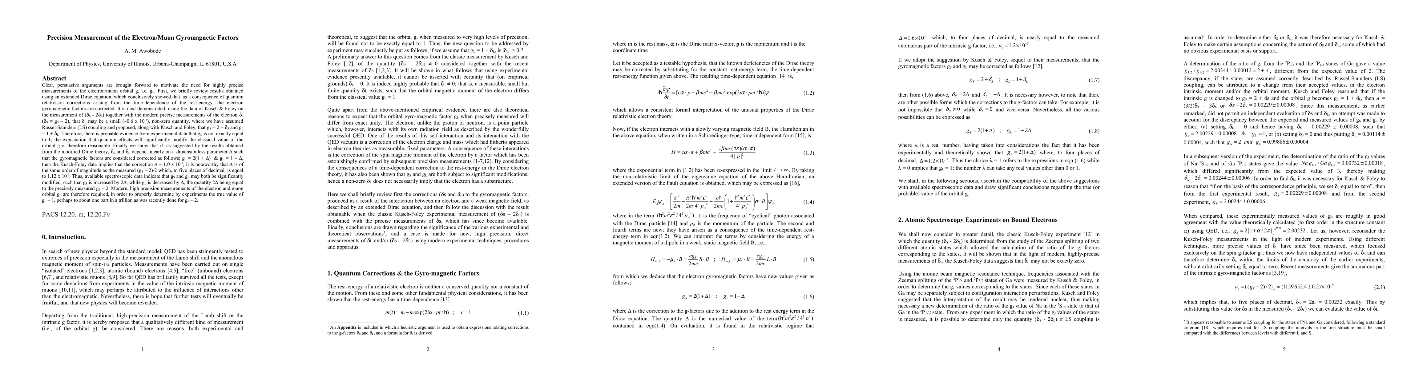 Clear, persuasive arguments are brought forward to motivate the need for highly precise measurements of the electron/muon orbital g, i.e. gL. First, we briefly review results obtained using an extended Dirac equation, which conclusively showed that, as a consequence of quantum relativistic corrections arising from the time-dependence of the rest-energy, the electron gyromagnetic factors are corrected. It is next demonstrated, using the data of Kusch & Foley on the measurement of deltaS minus 2 deltaL together with the modern precise measurements of the electron deltaS where deltaS identically equal to gS minus 2, that deltaL may be a small, non-zero quantity, where we have assumed Russel-Saunders LS coupling and proposed, along with Kusch and Foley, that gS = 2 plus deltaS and gS = 1 plus deltaL. Therefore, there is probable evidence from experimental data that gS is not exactly equal to 1; the expectation that quantum effects will significantly modify the classical value of the orbital g is therefore reasonable. Finally, we show that if, as suggested by the results obtained from the modified Dirac theory, deltaS and deltaL depend linearly on a dimensionless parameter DELTA such that the gyromagnetic factors are considered corrected as follows; gS = 2 plus 2 DELTA and gL = 1 minus DELTA, then the Kusch-Foley data implies that the correction DELTA approximately equals 1.0 times 10-3 . Modern, high precision measurements of the electron and muon orbital gL are therefore required, in order to properly determine by experiments the true value of gL minus 1, perhaps to about one part in a trillion as was recently done for gS minus 2.