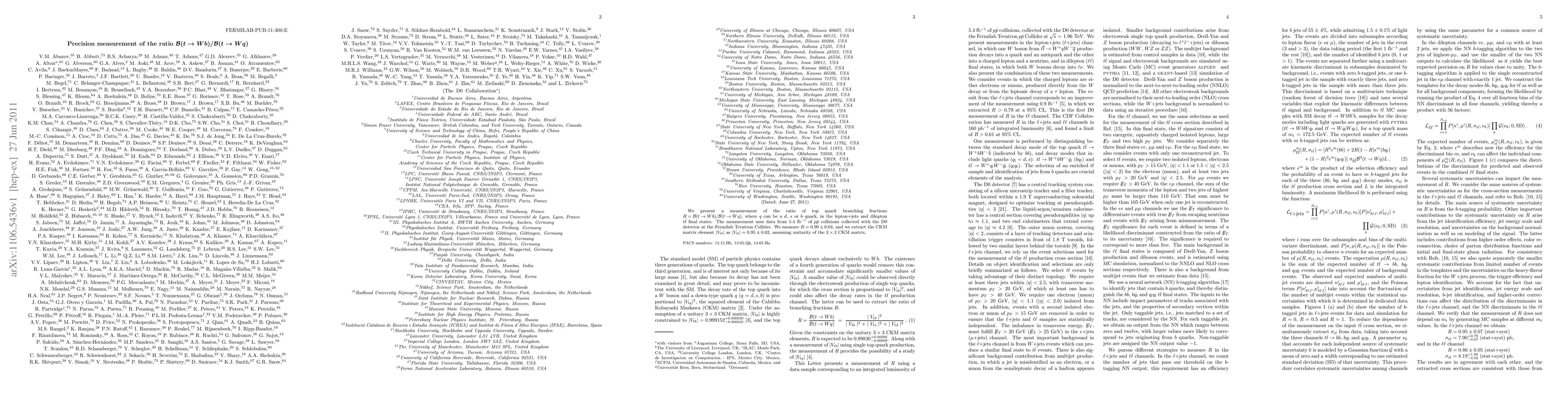 We present a measurement of the ratio of top quark branching fractions R = B(t -> Wb)/B(t -> Wq), where q can be a d, s or b quark, in the lepton+jets and dilepton ttbar final states. The measurement uses data from 5.4 fb-1 of ppbar collisions collected with the D0 detector at the Fermilab Tevatron Collider. We measure R = 0.90 +/- 0.04, and we extract the CKM matrix element |Vtb| as |Vtb| = 0.95 +/- 0.02, assuming unitarity of the 3x3 CKM matrix.
