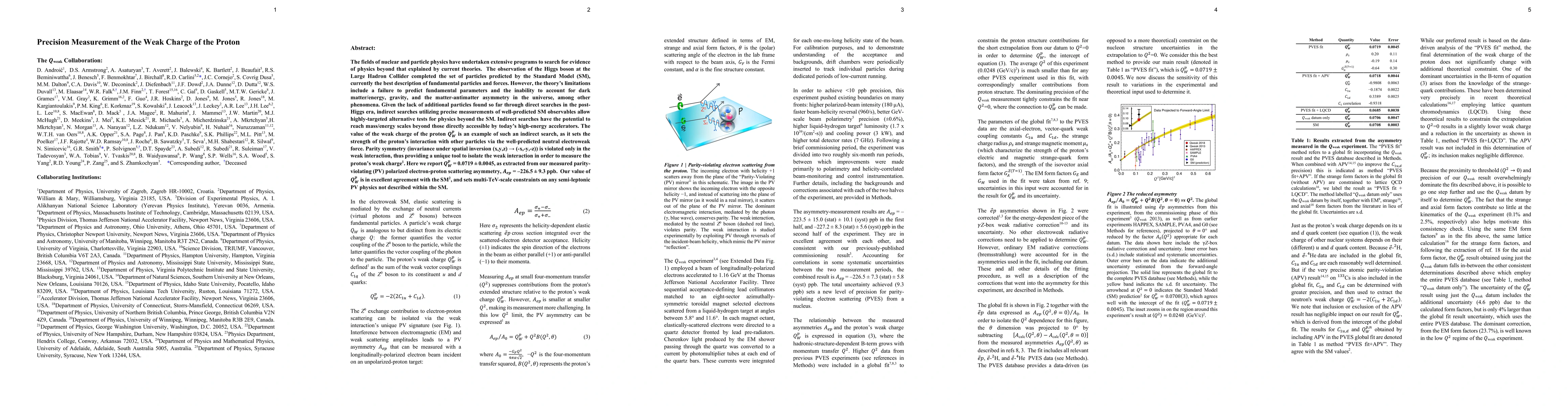 The fields of particle and nuclear physics have undertaken extensive programs to search for evidence of physics beyond that explained by current theories. The observation of the Higgs boson at the Large Hadron Collider completed the set of particles predicted by the Standard Model (SM), currently the best description of fundamental particles and forces. However, the theory's limitations include a failure to predict fundamental parameters and the inability to account for dark matter/energy, gravity, and the matter-antimater asymmetry in the universe, among other phenomena. Given the lack of additional particles found so far through direct searches in the post-Higgs era, indirect searches utilizing precise measurements of well predicted SM observables allow highly targeted alternative tests for physics beyond the SM. Indirect searches have the potential to reach mass/energy scales beyond those directly accessible by today's high-energy accelerators. The value of the weak charge of the proton Q_W^p is an example of such an indirect search, as it sets the strength of the proton's interaction with particles via the well-predicted neutral electroweak force. Parity violation (invariance under spatial inversion (x,y,z) -> (-x,-y,-z)) is violated only in the weak interaction, thus providing a unique tool to isolate the weak interaction in order to measure the proton's weak charge. Here we report Q_W^p=0.0719+-0.0045, as extracted from our measured parity-violating (PV) polarized electron-proton scattering asymmetry, A_ep=-226.5+-9.3 ppb. Our value of Q_W^p is in excellent agreement with the SM, and sets multi-TeV-scale constraints on any semi-leptonic PV physics not described within the SM.