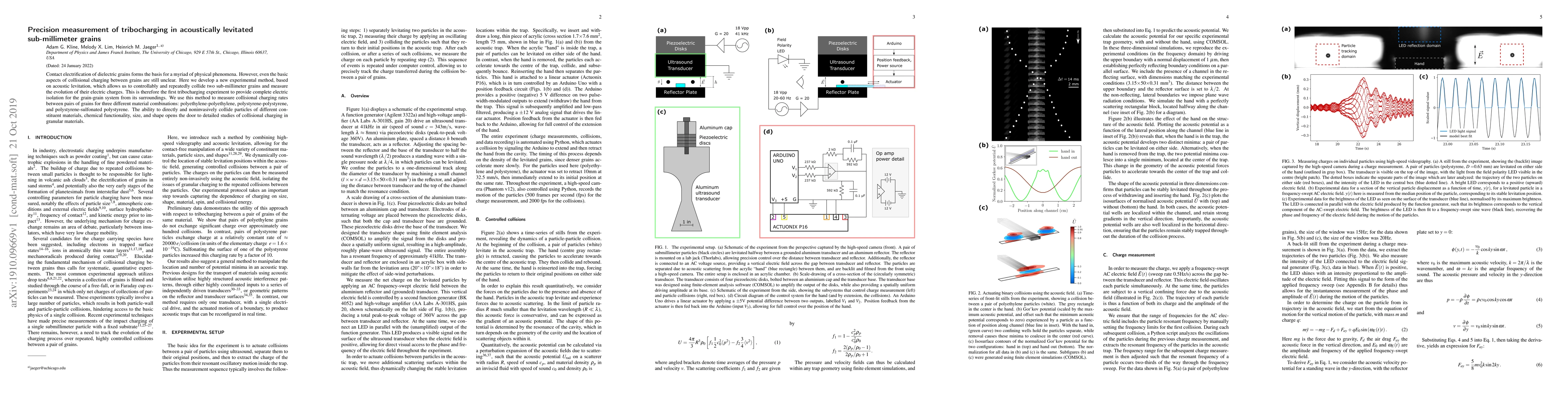 This paper introduces a novel acoustic levitation method to precisely measure tribocharging in sub-millimeter grains, achieving complete electric isolation. The study quantifies collisional charging rates for various material pairs, advancing understanding of contact electrification in granular materials.