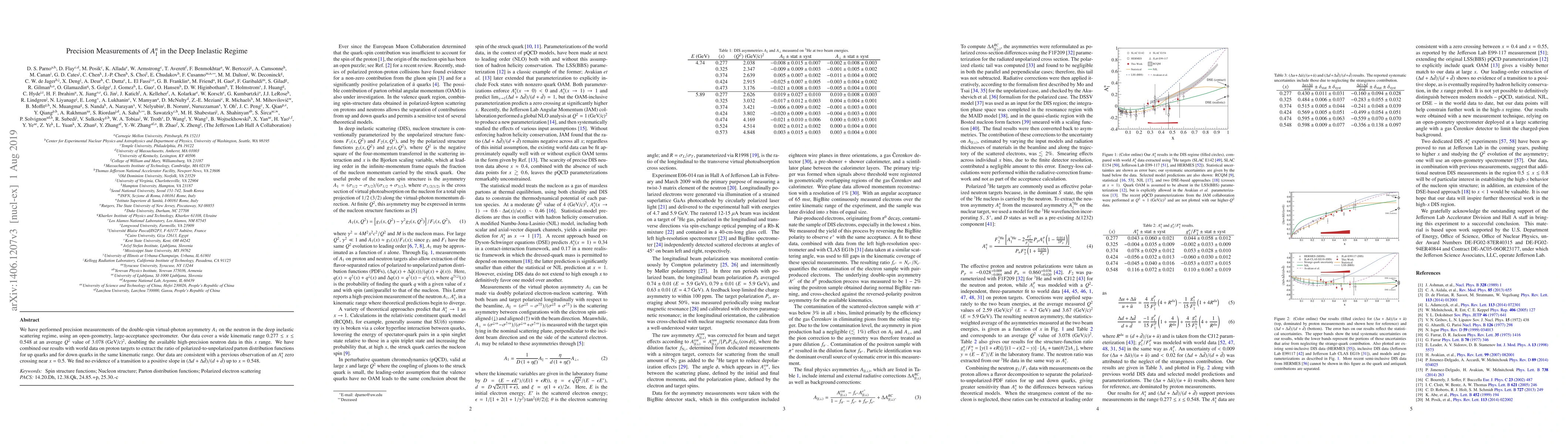 We have performed precision measurements of the double-spin virtual-photon asymmetry $A_1$ on the neutron in the deep inelastic scattering regime, using an open-geometry, large-acceptance spectrometer. Our data cover a wide kinematic range $0.277 \leq x \leq 0.548$ at an average $Q^2$ value of 3.078~(GeV/c)$^2$, doubling the available high-precision neutron data in this $x$ range. We have combined our results with world data on proton targets to extract the ratio of polarized-to-unpolarized parton distribution functions for up quarks and for down quarks in the same kinematic range. Our data are consistent with a previous observation of an $A_1^n$ zero crossing near $x=0.5$. We find no evidence of a transition to a positive slope in $(\Delta d + \Delta \bar{d})/(d + \bar{d})$ up to $x=0.548$.