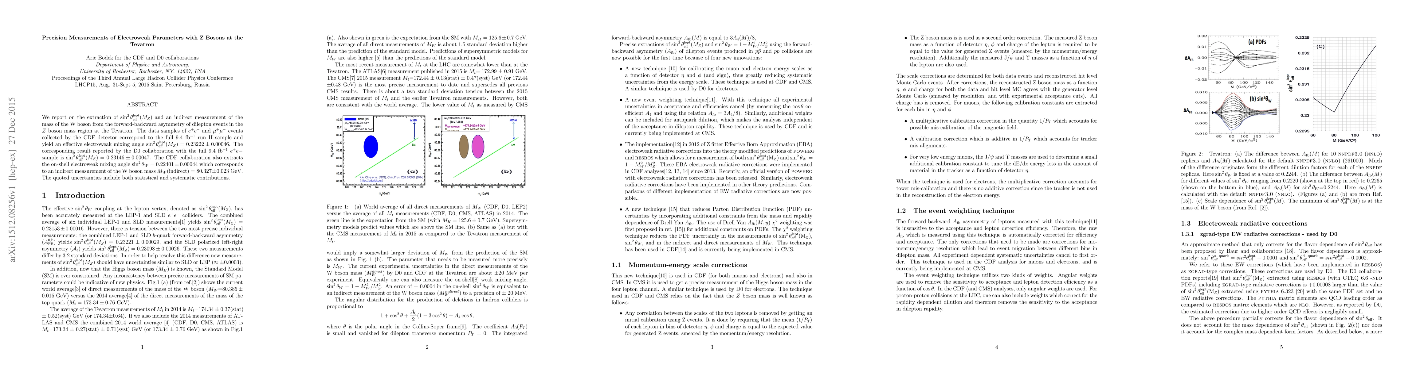 We report on the extraction of $\sin^2\theta^{\rm lept}_{\rm eff}(M_Z)$ and an indirect measurement of the mass of the W boson from the forward-backward asymmetry of dilepton events in the $Z$ boson mass region at the Tevatron. The data samples of $e^+e^-$ and $\mu^+\mu^-$ events collected by the CDF detector correspond to the full 9.4 fb$^{-1}$ run II sample and yield an effective electroweak mixing angle $\sin^2\theta^{\rm lept}_{\rm eff}(M_Z) = 0.23222 \pm 0.00046$. The corresponding result reported by the D0 collaboration with the full 9.4 fb$^{-1}$ $e^+e-$ sample is $\sin^2\theta^{\rm lept}_{\rm eff}(M_Z) = 0.23146 \pm 0.00047$. The CDF collaboration also extracts the on-shell electroweak mixing angle $ \sin^2 \theta_W = 0.22401 \pm 0.00044$ which corresponds to an indirect measurement of the W boson mass $M_W ({\rm indirect}) = 80.327 \pm 0.023 \;{\rm GeV}$. The quoted uncertainties include both statistical and systematic contributions.