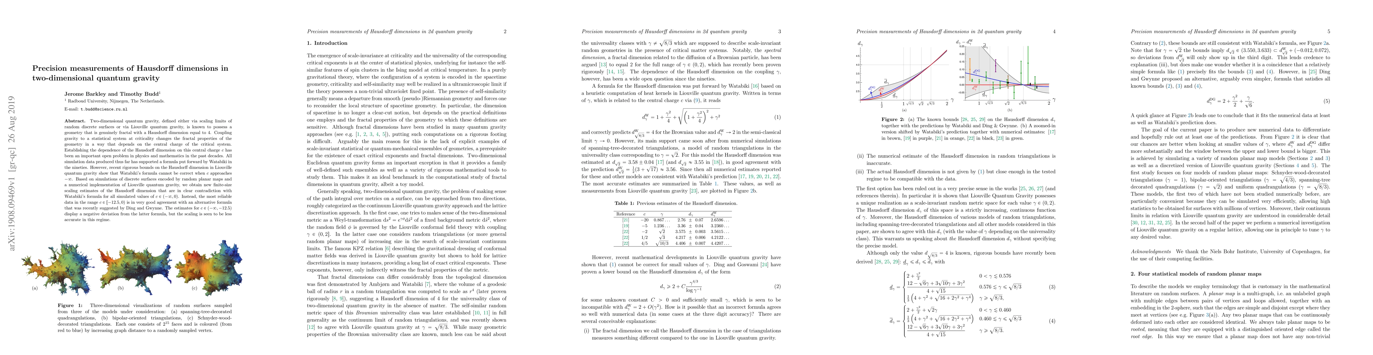 This paper provides new precision measurements of Hausdorff dimensions in two-dimensional quantum gravity, finding discrepancies with Watabiki's formula for central charges $c$ approaching $-\infty$. The results align well with an alternative formula proposed by Ding and Gwynne for $c\in [-12.5, 0)$, though estimates for $c\in(-\infty,-12.5)$ show a negative deviation.