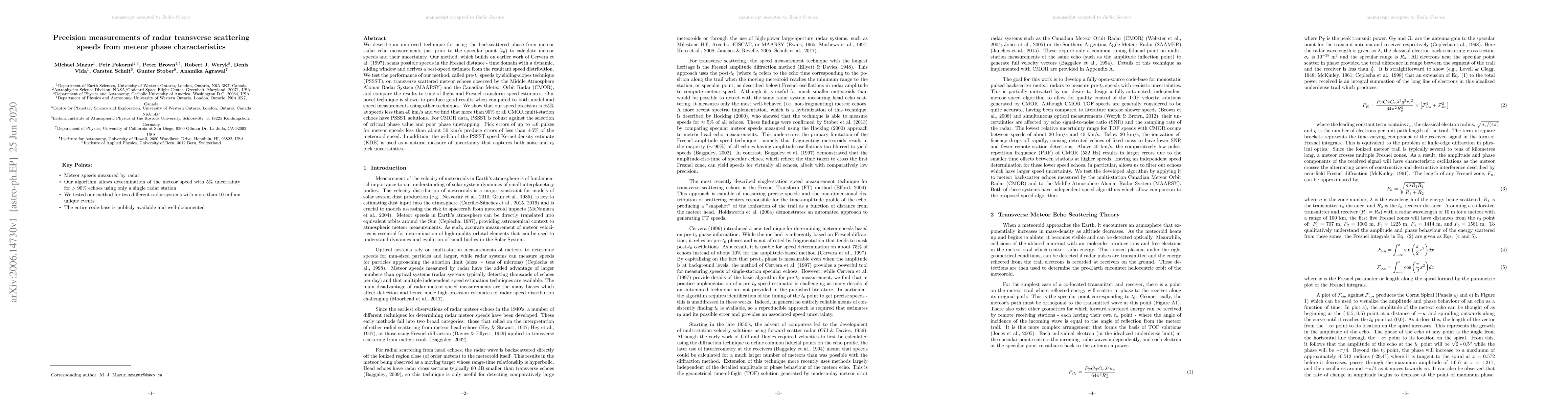 We describe an improved technique for using the backscattered phase from meteor radar echo measurements just prior to the specular point ($t_{0}$) to calculate meteor speeds and their uncertainty. Our method, which builds on earlier work of Cervera et al (1997), scans possible speeds in the Fresnel distance - time domain with a dynamic, sliding window and derives a best-speed estimate from the resultant speed distribution. We test the performance of our method, called pre-$t_{0}$ speeds by sliding-slopes technique (PSSST), on transverse scattered meteor echoes observed by the Middle Atmosphere Alomar Radar System (MAARSY) and the Canadian Meteor Orbit Radar (CMOR), and compare the results to time-of-flight and Fresnel transform speed estimates. Our novel technique is shown to produce good results when compared to both model and speed measurements using other techniques. We show that our speed precision is $\pm$5$\%$ at speeds less than 40 km/s and we find that more than 90$\%$ of all CMOR multi-station echoes have PSSST solutions. For CMOR data, PSSST is robust against the selection of critical phase value and poor phase unwrapping. Pick errors of up to $\pm$6 pulses for meteor speeds less than about 50 km/s produce errors of less than $\pm$5$\%$ of the meteoroid speed. In addition, the width of the PSSST speed Kernel density estimate (KDE) is used as a natural measure of uncertainty that captures both noise and $t_0$ pick uncertainties.