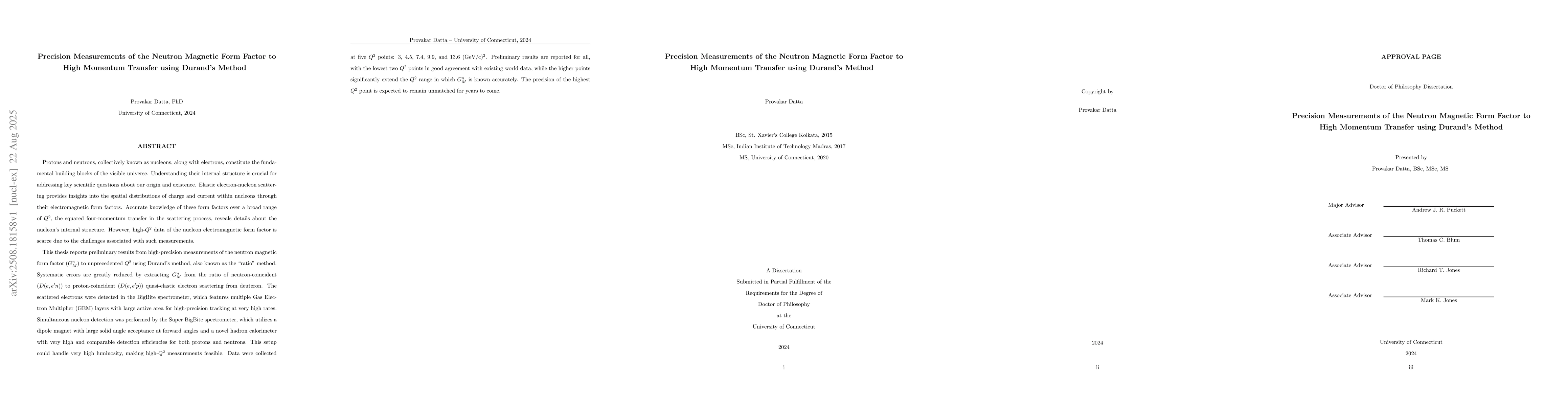 Elastic electron-nucleon scattering provides insights into the spatial distributions of charge and current within nucleons through their electromagnetic form factors. Accurate knowledge of these form factors over a broad range of $Q^2$, the squared four-momentum transfer in the scattering process, reveals details about the nucleon's internal structure. However, high-$Q^2$ data of the nucleon electromagnetic form factor is scarce due to the challenges associated with such measurements. This thesis reports preliminary results from high-precision measurements of the neutron magnetic form factor ($G_M^n$) to unprecedented $Q^2$ using Durand's method, also known as the "ratio" method. Systematic errors are greatly reduced by extracting $G_M^n$ from the ratio of neutron-coincident ($D(e,e'n)$) to proton-coincident ($D(e,e'p)$) quasi-elastic electron scattering from deuteron. The scattered electrons were detected in the BigBite spectrometer, which features multiple Gas Electron Multiplier (GEM) layers with large active area for high-precision tracking at very high rates. Simultaneous nucleon detection was performed by the Super BigBite spectrometer, which utilizes a dipole magnet with large solid angle acceptance at forward angles and a novel hadron calorimeter with very high and comparable detection efficiencies for both protons and neutrons. This setup could handle very high luminosity, making high-$Q^2$ measurements feasible. Data were collected at five $Q^2$ points: $3,$ $4.5,$ $7.4,$ $9.9,$ and $13.6$ (GeV/c)$^2$. Preliminary results are reported for all, with the lowest two $Q^2$ points in good agreement with existing world data, while the higher points significantly extend the $Q^2$ range in which $G_M^n$ is known accurately. The precision of the highest $Q^2$ point is expected to remain unmatched for years to come.