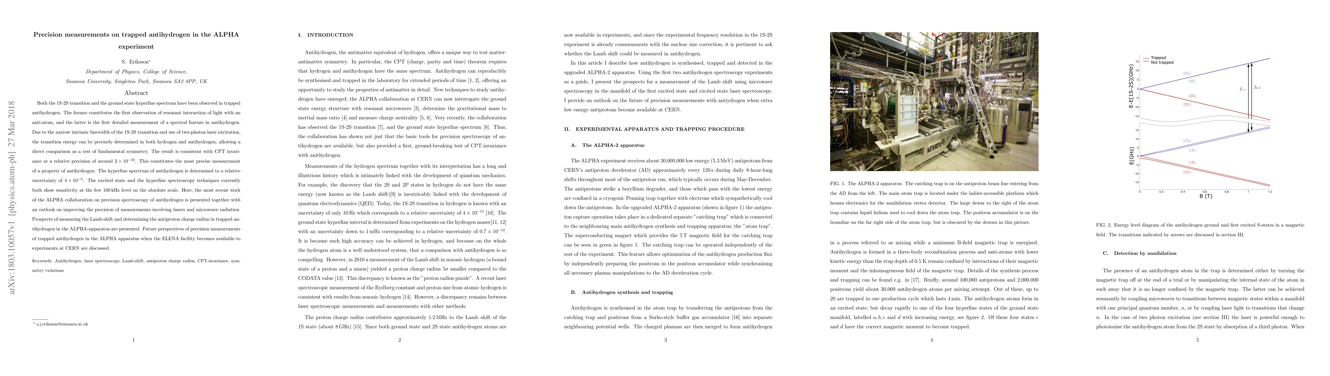 The ALPHA experiment has observed the 1S-2S transition and ground state hyperfine spectrum in trapped antihydrogen, achieving the first resonant interaction of light with an anti-atom and the most precise measurement of antihydrogen properties to date. The results support CPT invariance at a relative precision of \num{2e-10} and indicate future prospects for measuring the Lamb-shift and determining the antiproton charge radius.