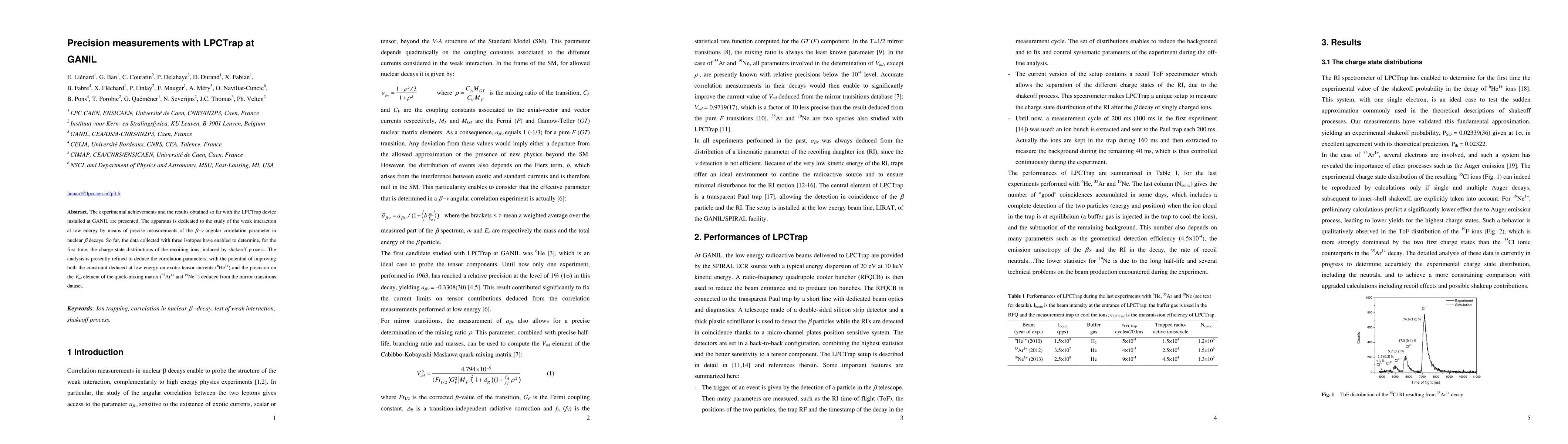 The experimental achievements and the results obtained so far with the LPCTrap device installed at GANIL are presented. The apparatus is dedicated to the study of the weak interaction at low energy by means of precise measurements of the BETA-NU angular correlation parameter in nuclear BETA decays. So far, the data collected with three isotopes have enabled to determine, for the first time, the charge state distributions of the recoiling ions, induced by shakeoff process. The analysis is presently refined to deduce the correlation parameters, with the potential of improving both the constraint deduced at low energy on exotic tensor currents (6He1+) and the precision on the V u d element of the quark-mixing matrix (35Ar1+ and 19Ne1+) deduced from the mirror transitions dataset.