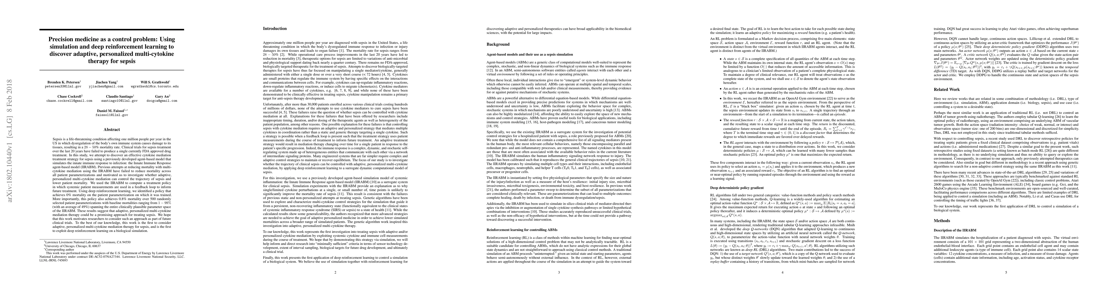 This study employs deep reinforcement learning on an agent-based model to discover adaptive, personalized multi-cytokine therapy for sepsis, achieving 0% mortality in trained scenarios and 0.8% mortality across diverse patient simulations, suggesting potential for effective sepsis treatment.