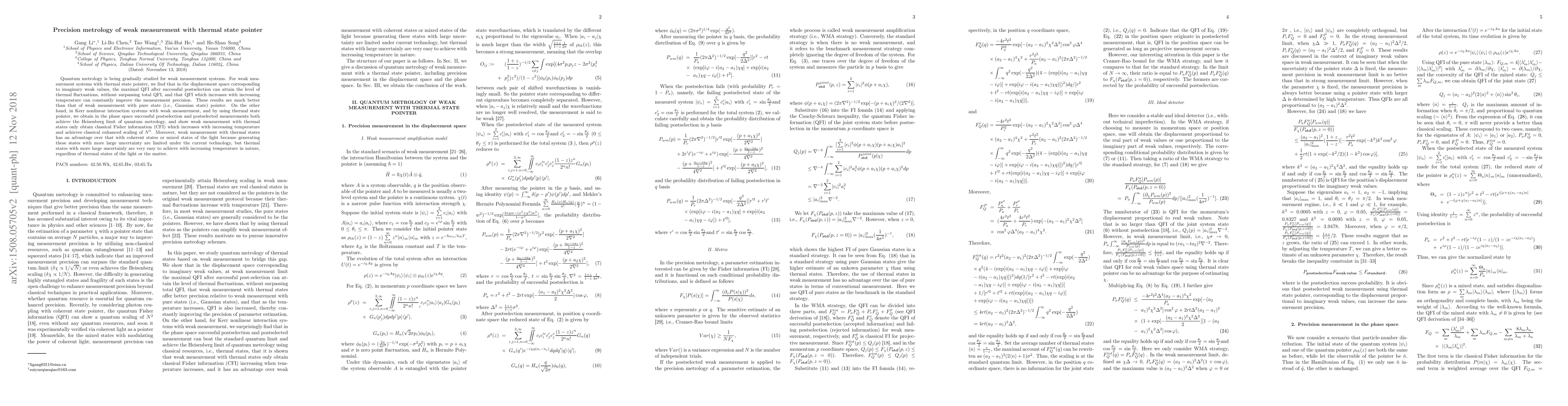 This paper investigates quantum metrology in weak measurement systems utilizing thermal state pointers, demonstrating enhanced precision in displacement and phase spaces compared to pure state pointers. The study shows that thermal states achieve higher precision and reach the Heisenberg limit, with increasing temperature yielding better measurement accuracy.