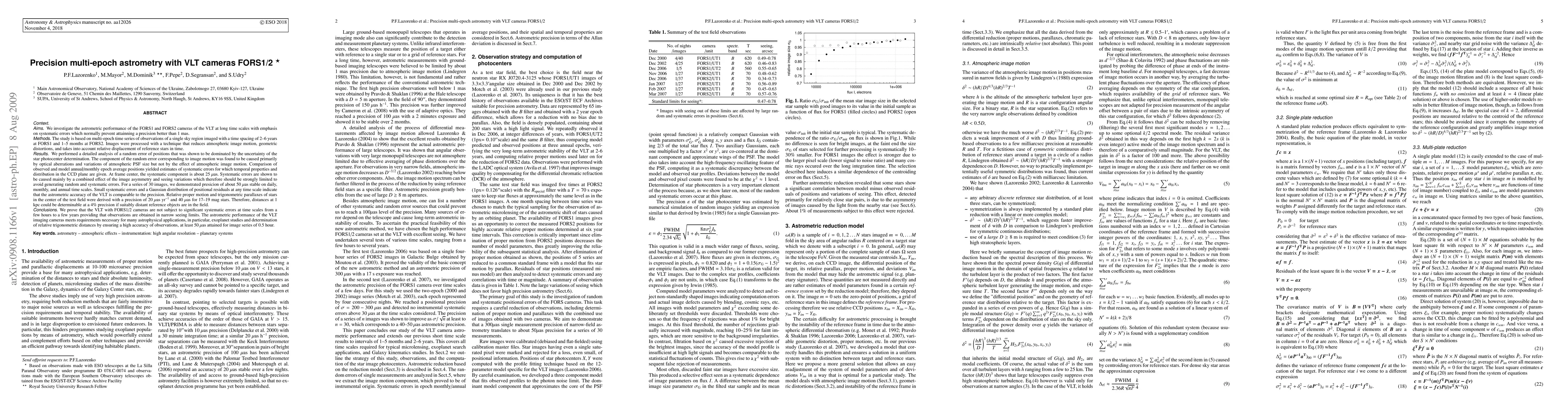 This research analyzes the astrometric precision of VLT's FORS1/2 cameras over long time scales, identifying systematic errors as the main limitation. Through multi-epoch observations, it finds that random errors stem from photocenter uncertainty, while systematic errors result from image asymmetry and seeing variations. The study achieves a position precision of 50 micro-arcseconds for a series of 30 images, stable across daily, monthly, and annual scales. It also derives relative proper motions and trigonometric parallaxes with precisions of 20 micro-arcseconds/year and 40 micro-arcseconds, respectively, for bright stars.