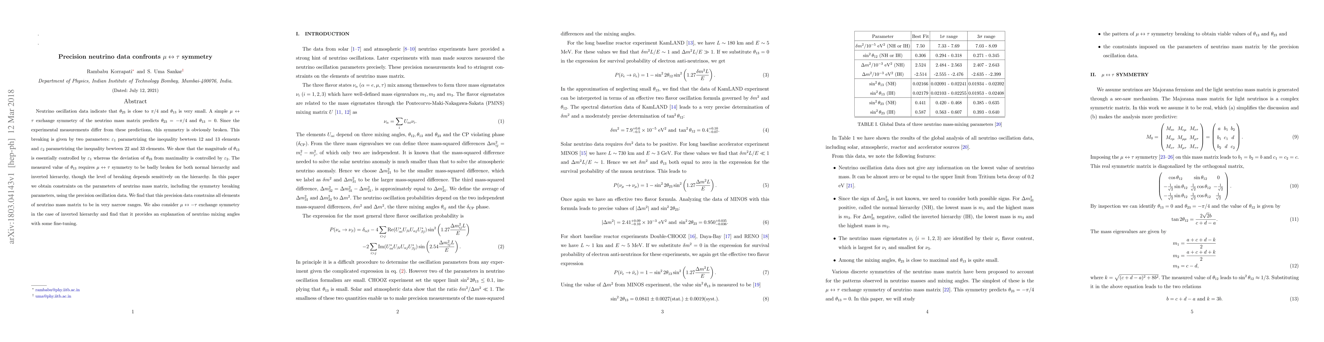 This paper examines how precision neutrino oscillation data challenges the $\mu\leftrightarrow\tau$ symmetry in the neutrino mass matrix, finding that the symmetry is significantly broken. It constrains the symmetry breaking parameters and shows that the smallness of $\theta_{13}$ and deviation of $\theta_{23}$ from maximality are controlled by these parameters, with implications varying for normal and inverted hierarchies.