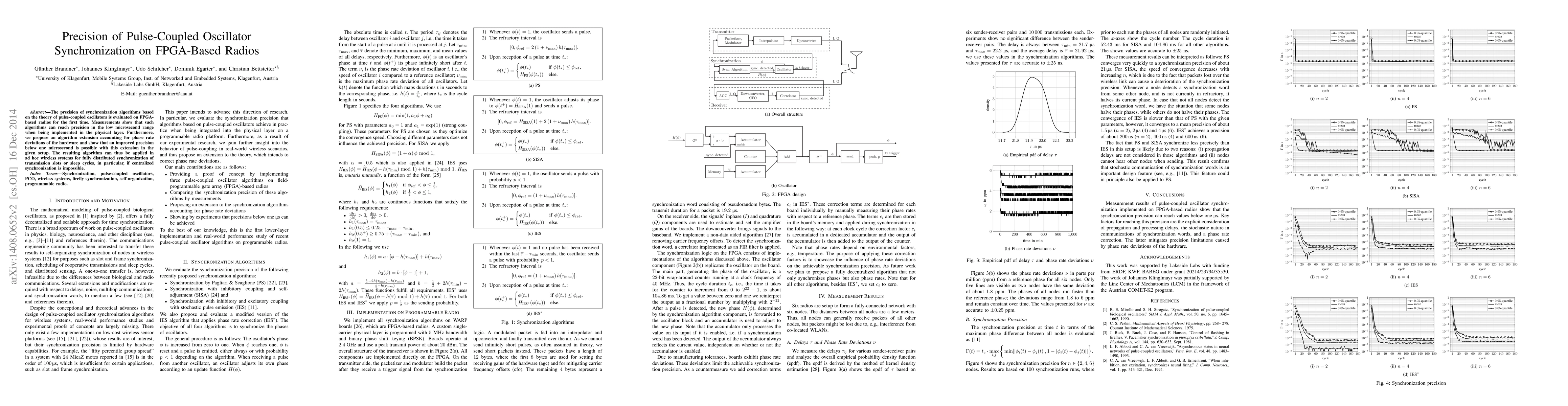 The precision of synchronization algorithms based on the theory of pulse-coupled oscillators is evaluated on FPGA-based radios for the first time. Measurements show that such algorithms can reach precision in the low microsecond range when being implemented in the physical layer. Furthermore, we propose an algorithm extension accounting for phase rate deviations of the hardware and show that an improved precision below one microsecond is possible with this extension in the given setup. The resulting algorithm can thus be applied in ad hoc wireless systems for fully distributed synchronization of transmission slots or sleep cycles, in particular, if centralized synchronization is impossible.