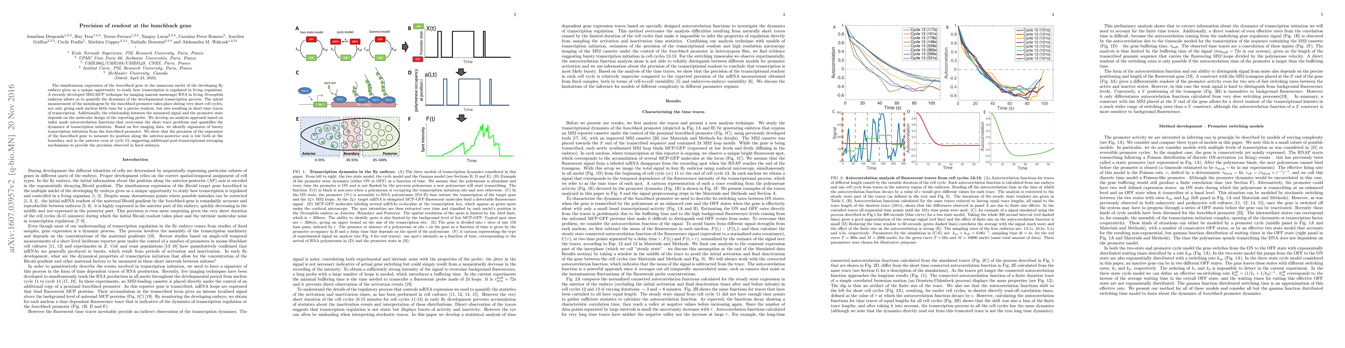 The simultaneous expression of the hunchback gene in the numerous nuclei of the developing fly embryo gives us a unique opportunity to study how transcription is regulated in living organisms. A recently developed MS2-MCP technique for imaging nascent messenger RNA in living Drosophila embryos allows us to quantify the dynamics of the developmental transcription process. The initial measurement of the morphogens by the hunchback promoter takes place during very short cell cycles, not only giving each nucleus little time for a precise readout, but also resulting in short time traces of transcription. Additionally, the relationship between the measured signal and the promoter state depends on the molecular design of the reporting probe. We develop an analysis approach based on tailor made autocorrelation functions that overcomes the short trace problems and quantifies the dynamics of transcription initiation. Based on live imaging data, we identify signatures of bursty transcription initiation from the hunchback promoter. We show that the precision of the expression of the hunchback gene to measure its position along the anterior-posterior axis is low both at the boundary and in the anterior even at cycle 13, suggesting additional post-transcriptional averaging mechanisms to provide the precision observed in fixed embryos.