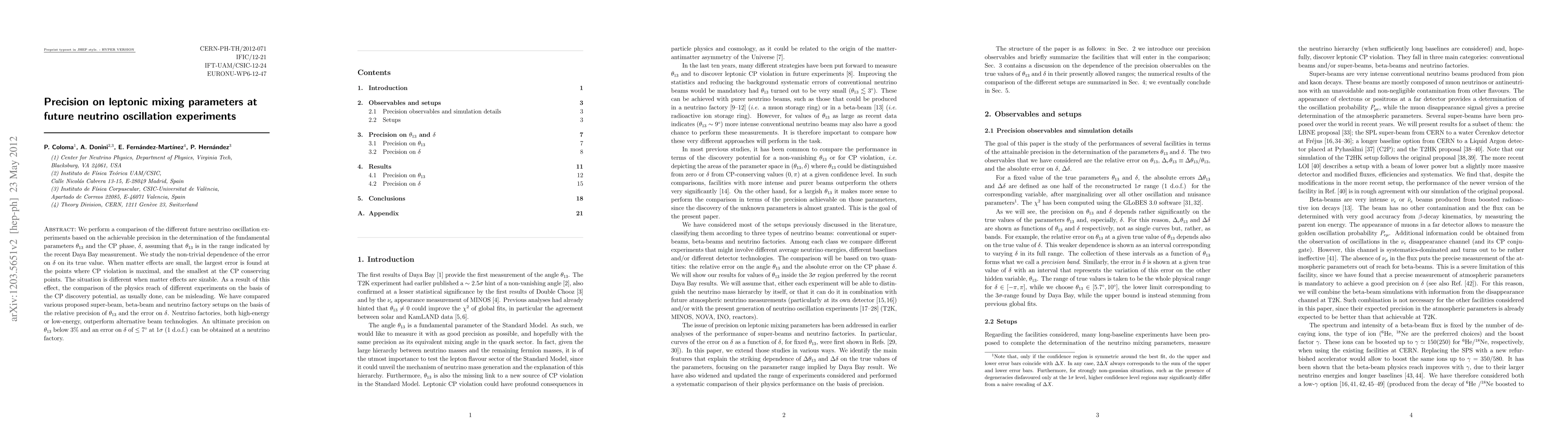 This paper compares future neutrino oscillation experiments to determine the precision of leptonic mixing parameters theta_{13} and the CP phase delta. It finds that neutrino factories achieve superior precision, with potential errors of < 3% on theta_{13} and < 7^{\circ} on delta, outperforming other beam technologies due to varying matter effects.