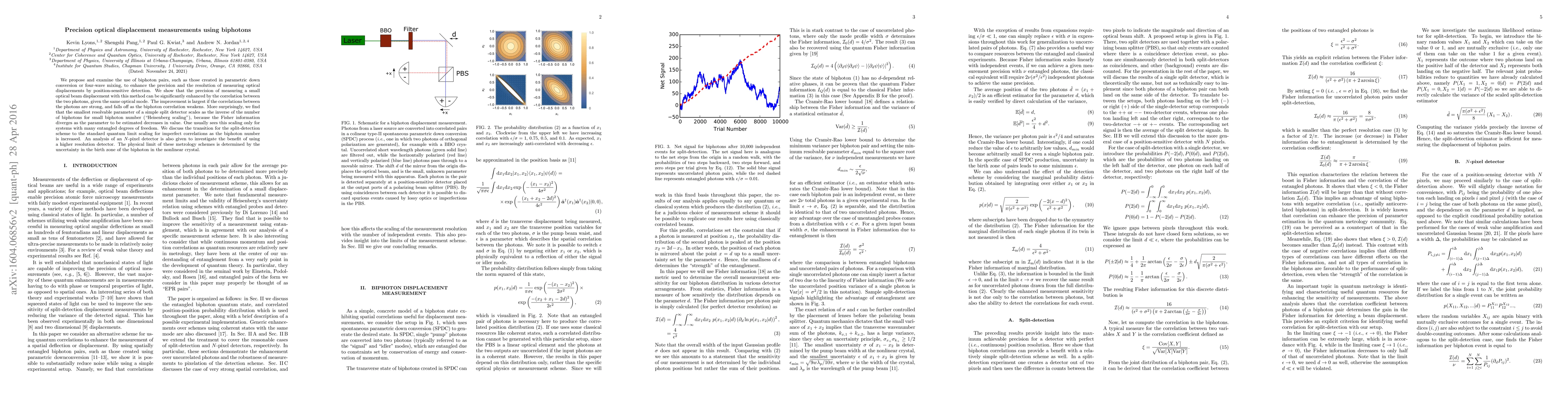 We propose and examine the use of biphoton pairs, such as those created in parametric down conversion or four-wave mixing, to enhance the precision and the resolution of measuring optical displacements by position-sensitive detection. We show that the precision of measuring a small optical beam displacement with this method can be significantly enhanced by the correlation between the two photons, given the same optical mode. The improvement is largest if the correlations between the photons are strong, and falls off as the biphoton correlation weakens. More surprisingly, we find that the smallest resolvable parameter of a simple split detector scales as the inverse of the number of biphotons for small biphoton number ("Heisenberg scaling"), because the Fisher information diverges as the parameter to be estimated decreases in value. One usually sees this scaling only for systems with many entangled degrees of freedom. We discuss the transition for the split-detection scheme to the standard quantum limit scaling for imperfect correlations as the biphoton number is increased. An analysis of an $N$-pixel detector is also given to investigate the benefit of using a higher resolution detector. The physical limit of these metrology schemes is determined by the uncertainty in the birth zone of the biphoton in the nonlinear crystal.