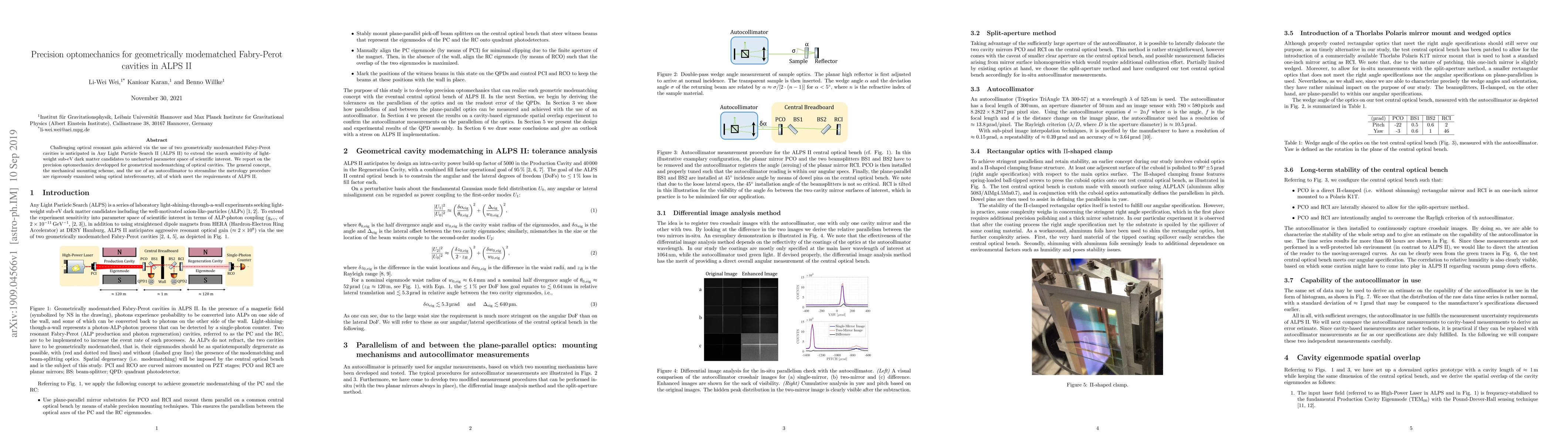 This paper details the precision optomechanics developed for geometrically modematching Fabry-Perot cavities in ALPS II, aiming to enhance the search sensitivity for sub-eV dark matter candidates. The methodology includes a mechanical mounting scheme and autocollimator-based metrology, validated through optical interferometry.