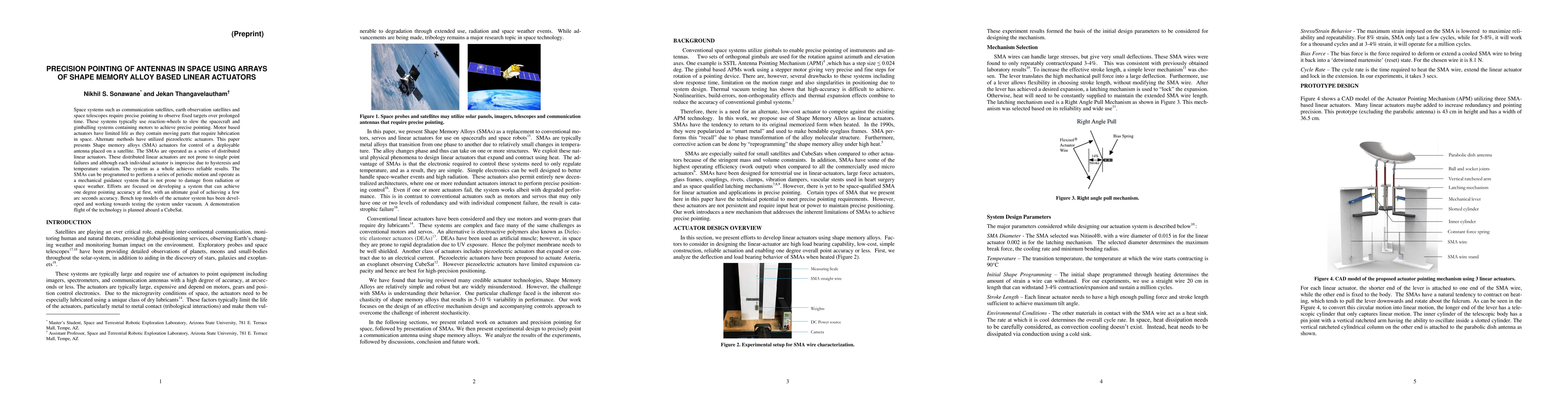 This paper explores the use of shape memory alloy (SMA) based linear actuators for precise antenna pointing in space, aiming to replace traditional motor-based systems. The distributed SMA actuators offer reliability and radiation resistance, with initial goals set for one degree accuracy, progressing towards finer precision.