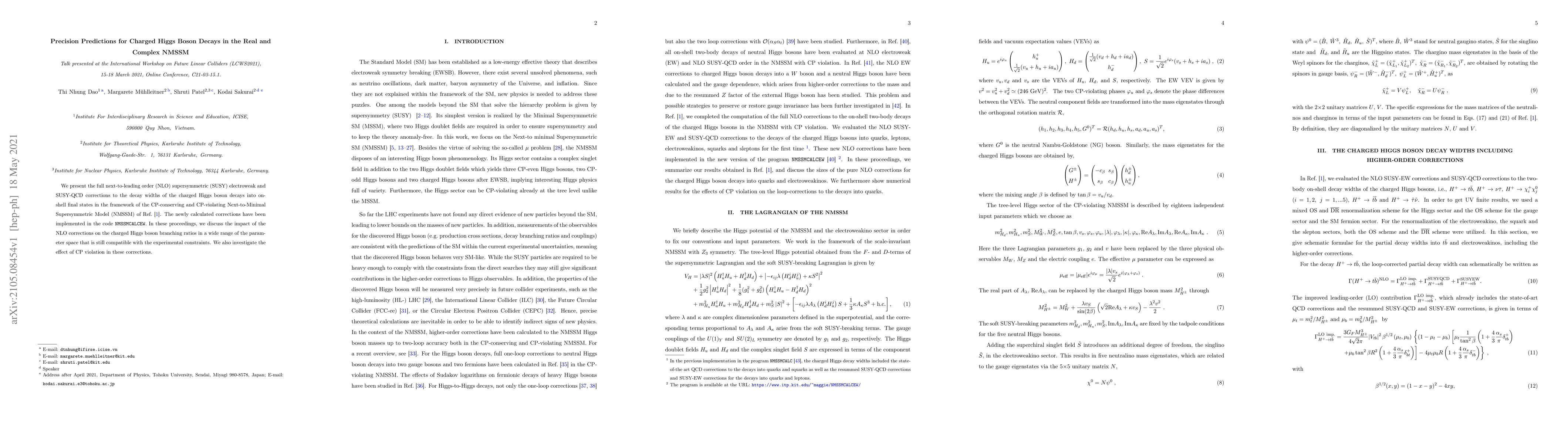 This paper provides full next-to-leading order (NLO) supersymmetric corrections for charged Higgs boson decays in the NMSSM, implemented in NMSSMCALCEW. It examines the impact of these corrections on branching ratios and explores the influence of CP-violation across various parameter spaces.