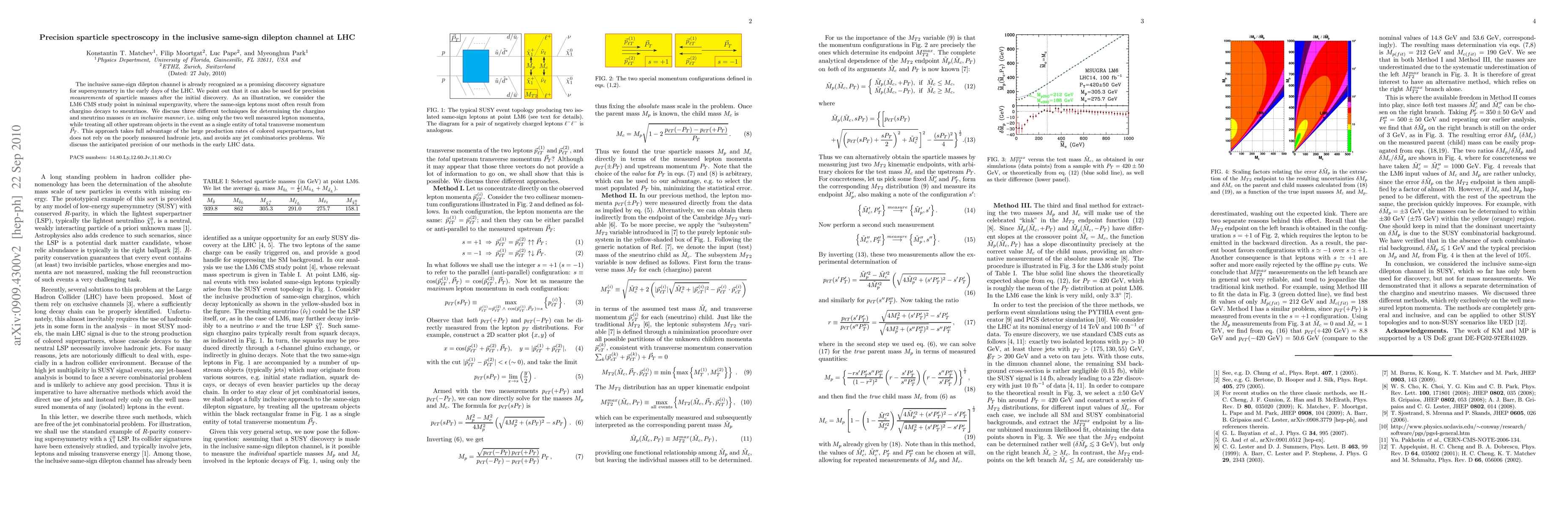 This paper explores the inclusive same-sign dilepton channel at the LHC for precision measurements of sparticle masses post-discovery, focusing on chargino and sneutrino mass determination using three inclusive techniques. The methods avoid jet combinatorics issues and leverage large production rates of colored superpartners.