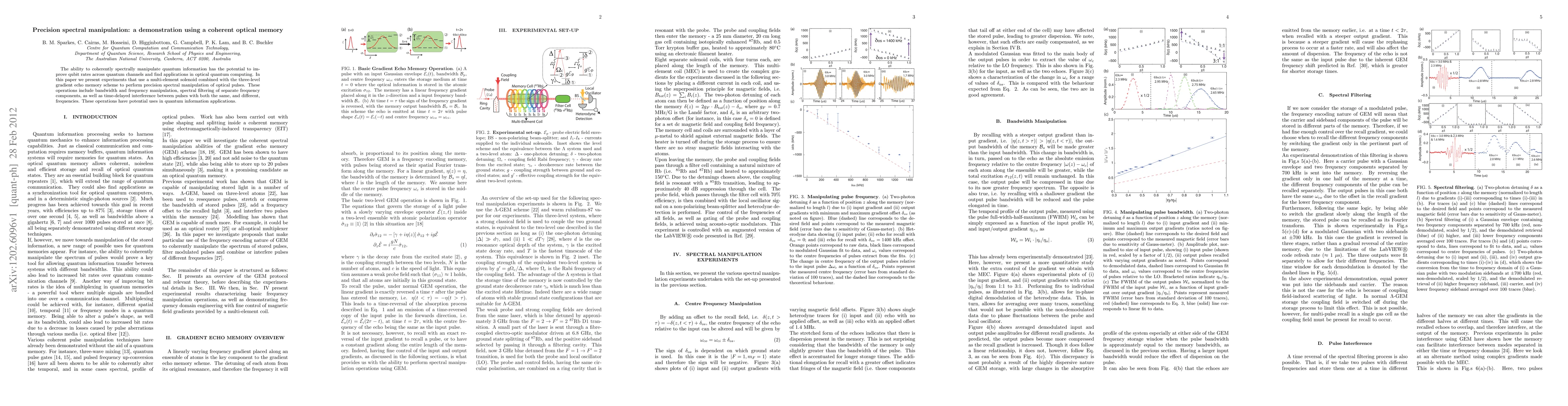 This paper demonstrates precision spectral manipulation using a coherent optical memory, employing a multi-element solenoid and a three-level gradient echo memory scheme to manipulate bandwidth, frequency, and spectral filtering of optical pulses, with potential applications in quantum computing.