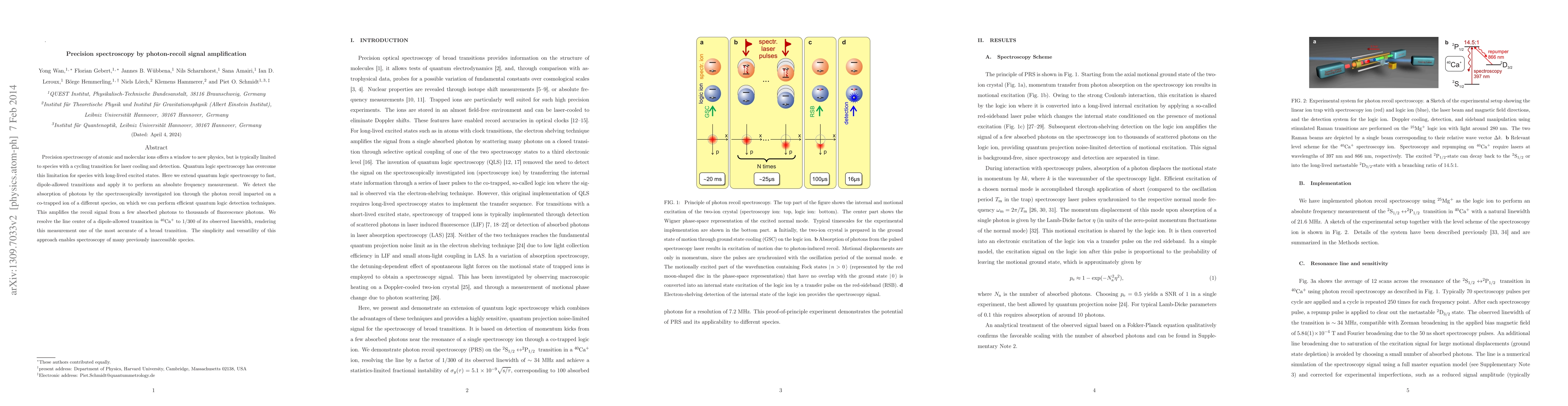 This paper presents a novel method for precision spectroscopy by amplifying photon-recoil signals, enabling accurate measurements of fast, dipole-allowed transitions in ions. The method uses a co-trapped ion to detect photon absorption through recoil, significantly enhancing signal detection and achieving high accuracy in measuring the linewidth of 40Ca+.