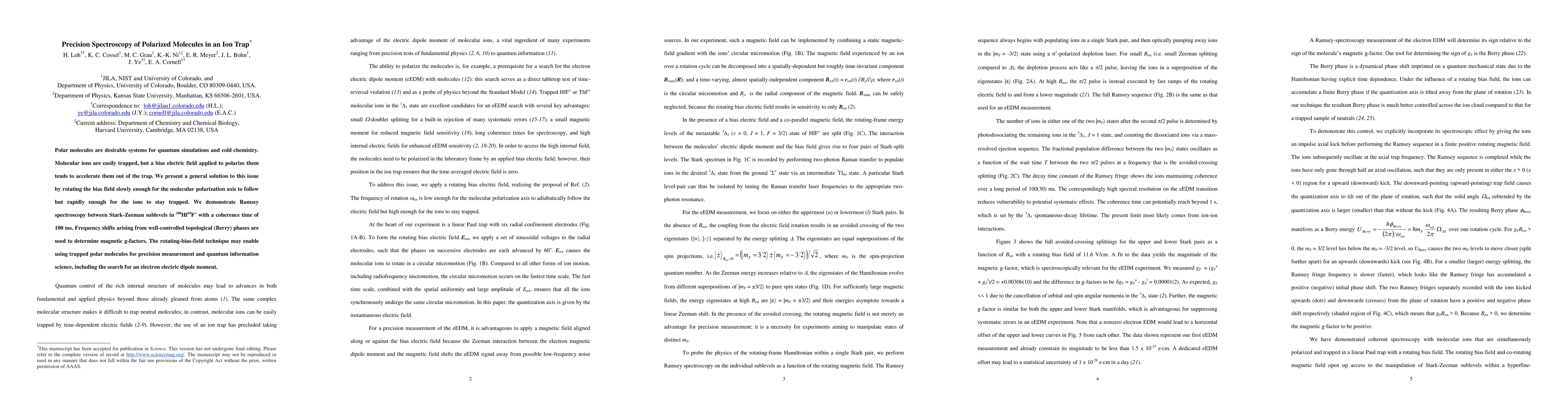 This paper presents a novel method to trap and polarize molecular ions in an ion trap by slowly rotating the bias electric field, allowing for precision spectroscopy. The technique demonstrates Ramsey spectroscopy in 180Hf19F+ with a coherence time of 100 ms, enabling the determination of magnetic g-factors and potentially opening pathways for precision measurements and quantum information science.