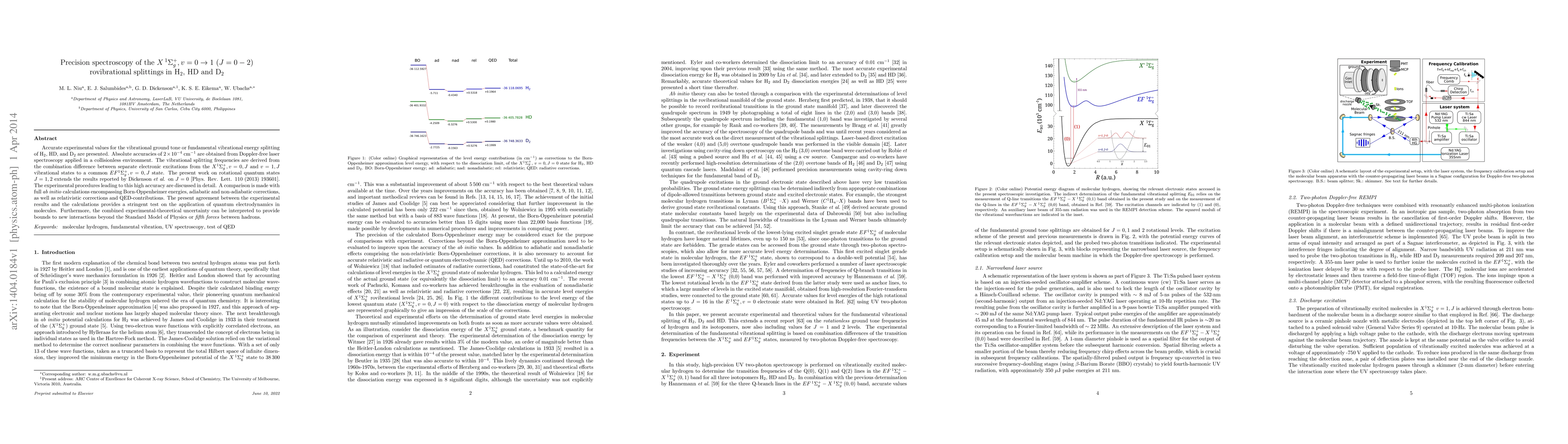 This paper reports precise spectroscopic measurements of rovibrational splittings in H$_2$, HD, and D$_2$ using Doppler-free laser techniques, achieving accuracies of $2\times10^{-4}$ cm$^{-1}$. The results are compared with \emph{ab initio} calculations, providing a stringent test for quantum electrodynamics and potential bounds on new physics beyond the Standard Model.