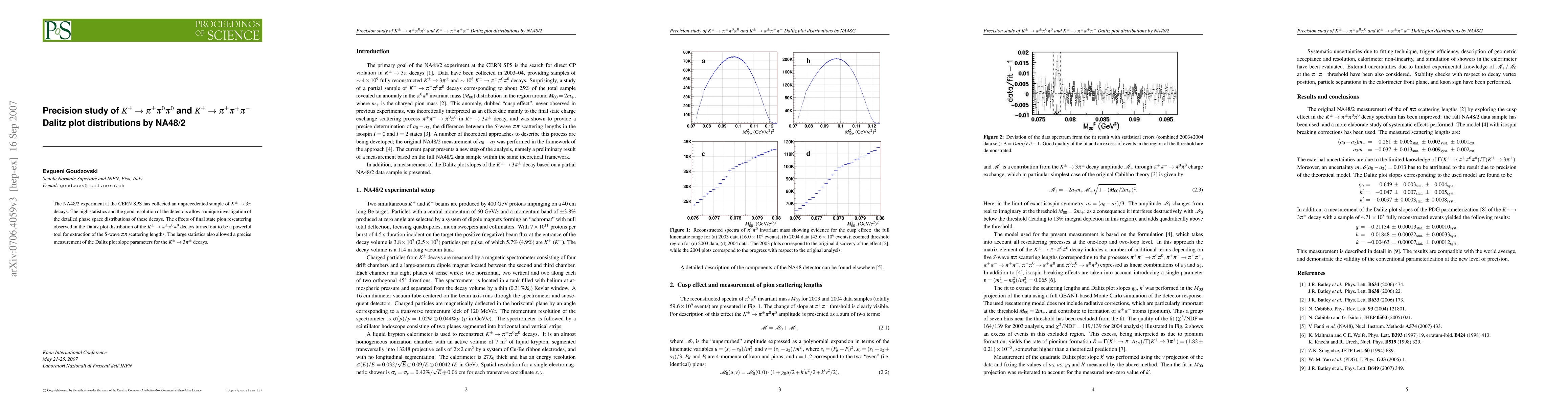 The NA48/2 experiment at CERN SPS provides a detailed analysis of $K^\pm\to3\pi$ decays, revealing final state pion rescattering effects in $K^\pm\to\pi^\pm\pi^0\pi^0$ Dalitz plots and enabling precise extraction of S-wave $\pi\pi$ scattering lengths. Additionally, the study measures Dalitz plot slope parameters for $K^\pm\to3\pi^\pm$ decays with high precision.