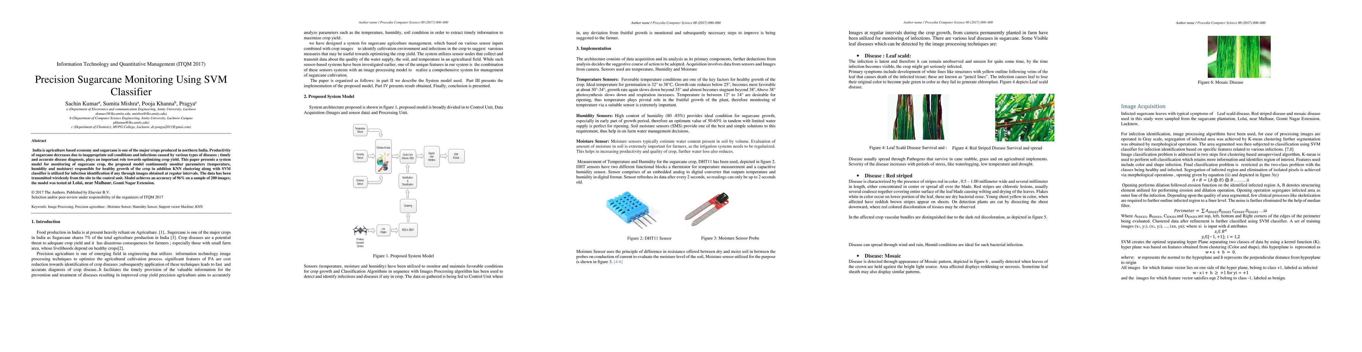 This paper proposes a system using SVM classifiers and KNN clustering for precision monitoring of sugarcane crops in northern India, focusing on identifying infections through image analysis. The model achieves 96% accuracy in diagnosing diseases based on environmental parameters and image data transmitted wirelessly.