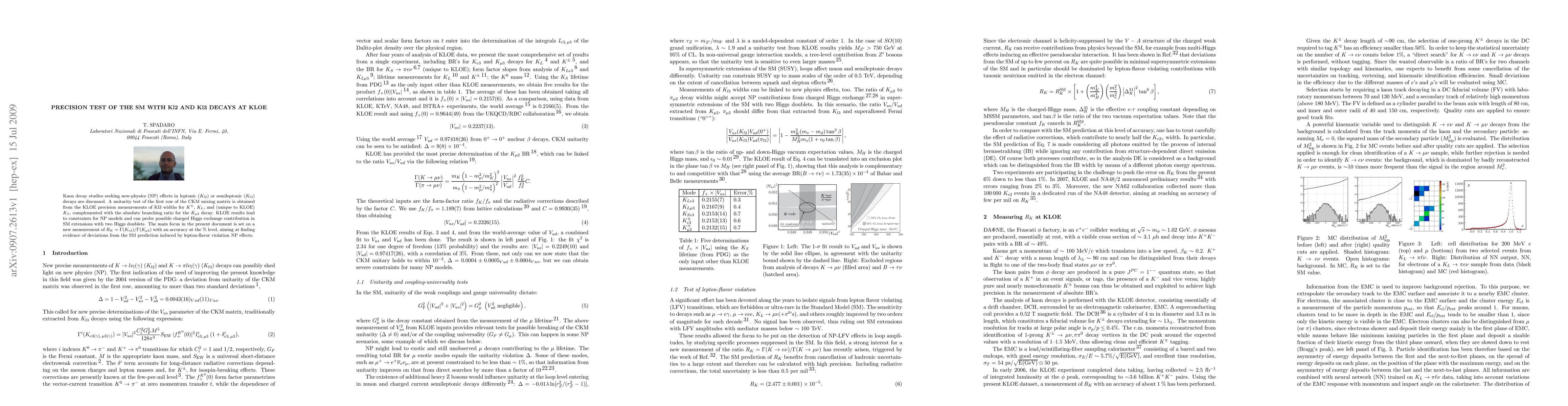 Kaon decay studies seeking new-physics (NP) effects in leptonic (K_l2) or semileptonic (K_l3) decays are discussed. A unitarity test of the first row of the CKM mixing matrix is obtained from the KLOE precision measurements of Kl3 widths for K^+-, K_L, and (unique to KLOE) K_S, complemented with the absolute branching ratio for the K_mu2 decay. KLOE results lead to constraints for NP models and can probe possible charged Higgs exchange contribution in SM extensions with two Higgs doublets. The main focus in the present document is set on a new measurement of R_K=Gamma(K_e2)/Gamma(K_mu2) with an accuracy at the % level, aiming at finding evidence of deviations from the SM prediction induced by lepton-flavor violation NP effects.