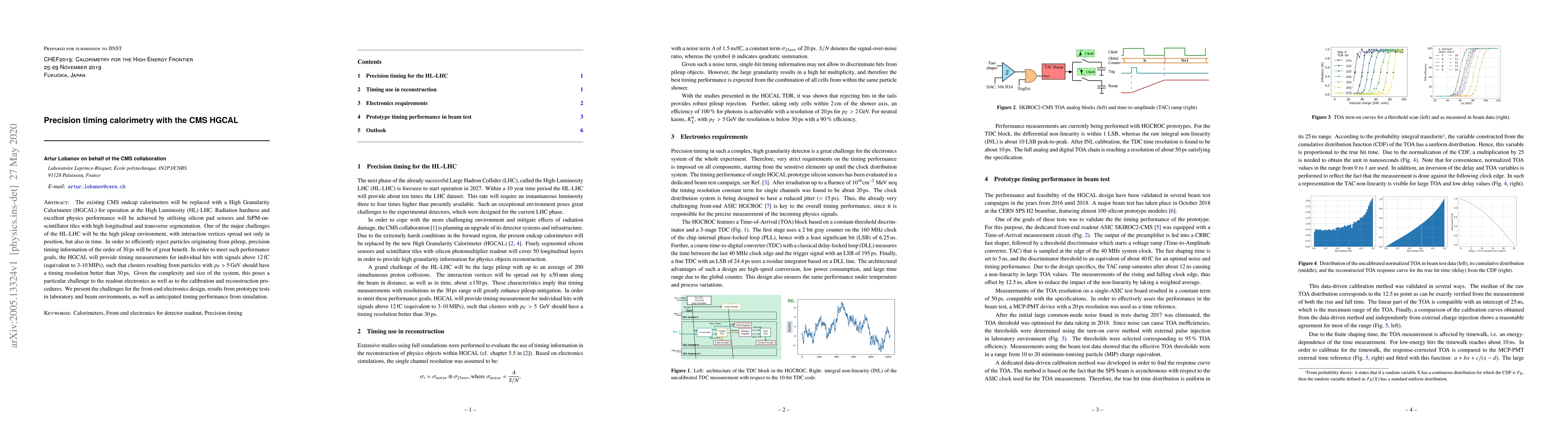 The existing CMS endcap calorimeters will be replaced with a High Granularity Calorimeter (HGCAL) for operation at the High Luminosity (HL) LHC. Radiation hardness and excellent physics performance will be achieved by utilising silicon pad sensors and SiPM-on-scintillator tiles with high longitudinal and transverse segmentation. One of the major challenges of the HL-LHC will be the high pileup environment, with interaction vertices spread not only in position, but also in time. In order to efficiently reject particles originating from pileup, precision timing information of the order of 30 ps will be of great benefit. In order to meet such performance goals, the HGCAL will provide timing measurements for individual hits with signals above 12 fC (equivalent to 3-10 MIPs), such that clusters resulting from particles with $p_T$ > 5 GeV should have a timing resolution better than 30 ps. Given the complexity and size of the system, this poses a particular challenge to the readout electronics as well as to the calibration and reconstruction procedures. We present the challenges for the front-end electronics design, results from prototype tests in laboratory and beam environments, as well as anticipated timing performance from simulation.