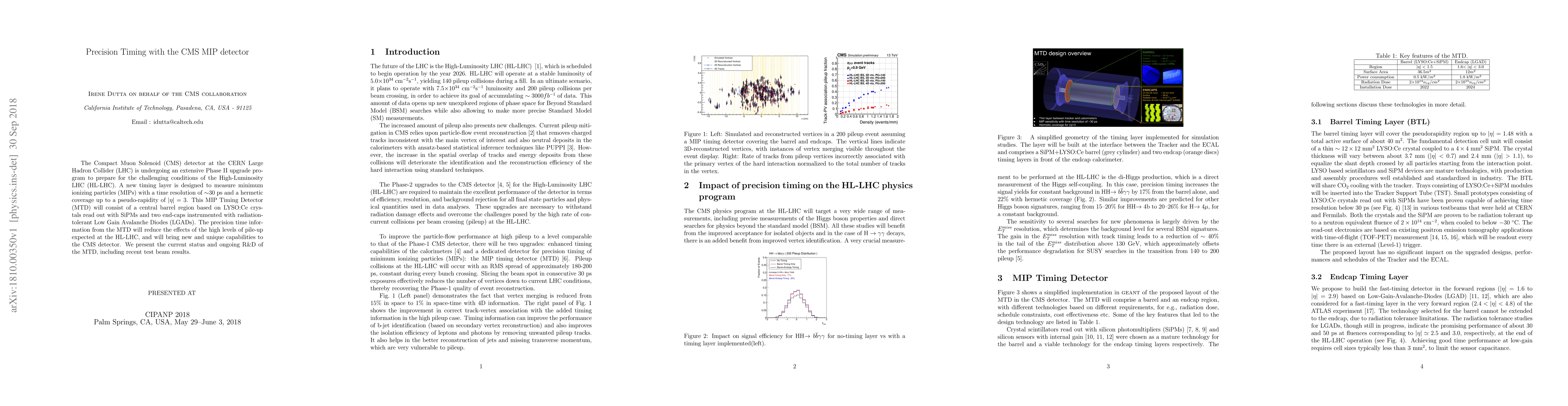 The CMS MIP Timing Detector (MTD) aims to enhance the CMS detector's precision timing capabilities with a time resolution of 30 ps, crucial for managing high pile-up conditions at the High-Luminosity LHC. The MTD integrates LYSO:Ce crystals and SiPMs in the central region and LGADs in the end-caps, offering comprehensive coverage and new measurement capabilities.